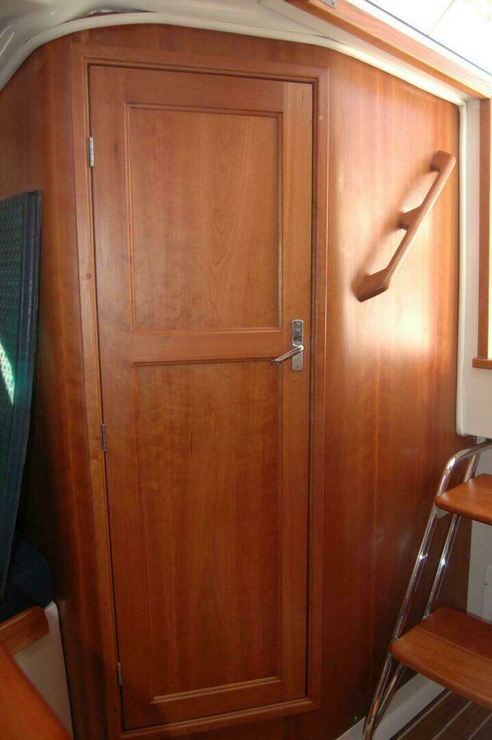 Stepping below into the cabin, you are greeted by the warm appointments which make Back Cove famous. Forward, there is a table which offers seating on either side in the bow. This table converts down to make a berth if overnight accommodation is needed. Aft of the settees is a large enclosed wet head to starboard, which offers hot & cold pressurized water, shower, and marine head. Storage may be found throughout. Opposite the head is the galley which features a stainless steel sink, single burner stove, microwave oven, refrigerator, and good storage.