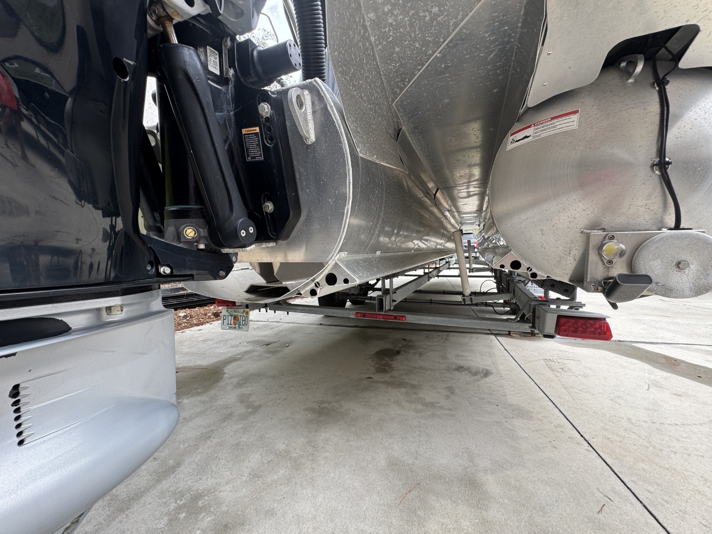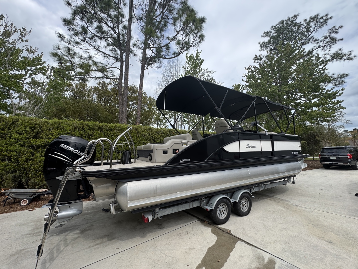 The 2019 Barletta L25UC L-Class is a tritoon with 26" tubes and lifting stakes, making her a fast pontoon. Measuring 27.5 feet in overall length, this vessel is crafted from durable aluminum, ensuring longevity and stability on the water. Powered by a 400 hp Mercury Verado outboard engine, she cruises between 22-28 mph, and has top speed of approximately 47-52 mph. The L25UCL comfortably accommodates up to 14 passengers, making her the perfect boat for group outings. Her pontoon shape provides buoyancy and stability for security on the water. Modern features and a spacious layout makes this boat ideal for taking in scenic views or a full day of watersports. An EZ Loader tandem-axle trailer is included in the sale of this vessel.