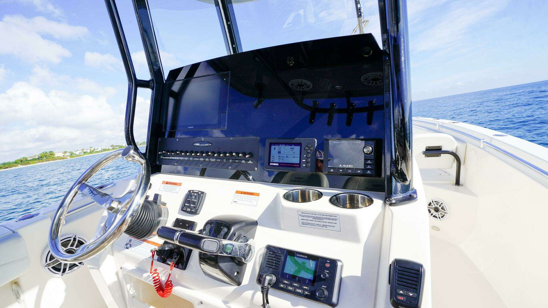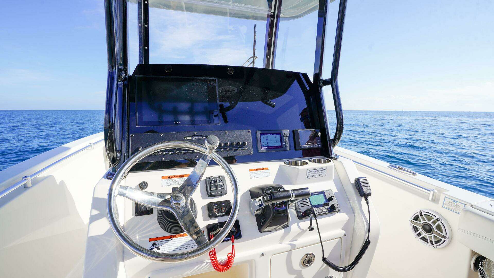 Moving forward, the leaning post becomes the centerpiece of the helm area. At the helm, the modern black acrylic dash provides a clean, modern look, with room for large Garmin multifunction displays. Yamaha digital controls, stainless GEM wheel, trim tabs, and easy-to-read gauges all fall naturally at hand. Above, the fiberglass hardtop delivers shade, integrated lighting, and rod holders, adding capability and polish to the design. The 360° view from the helm underscores the confidence this boat inspires on the water.