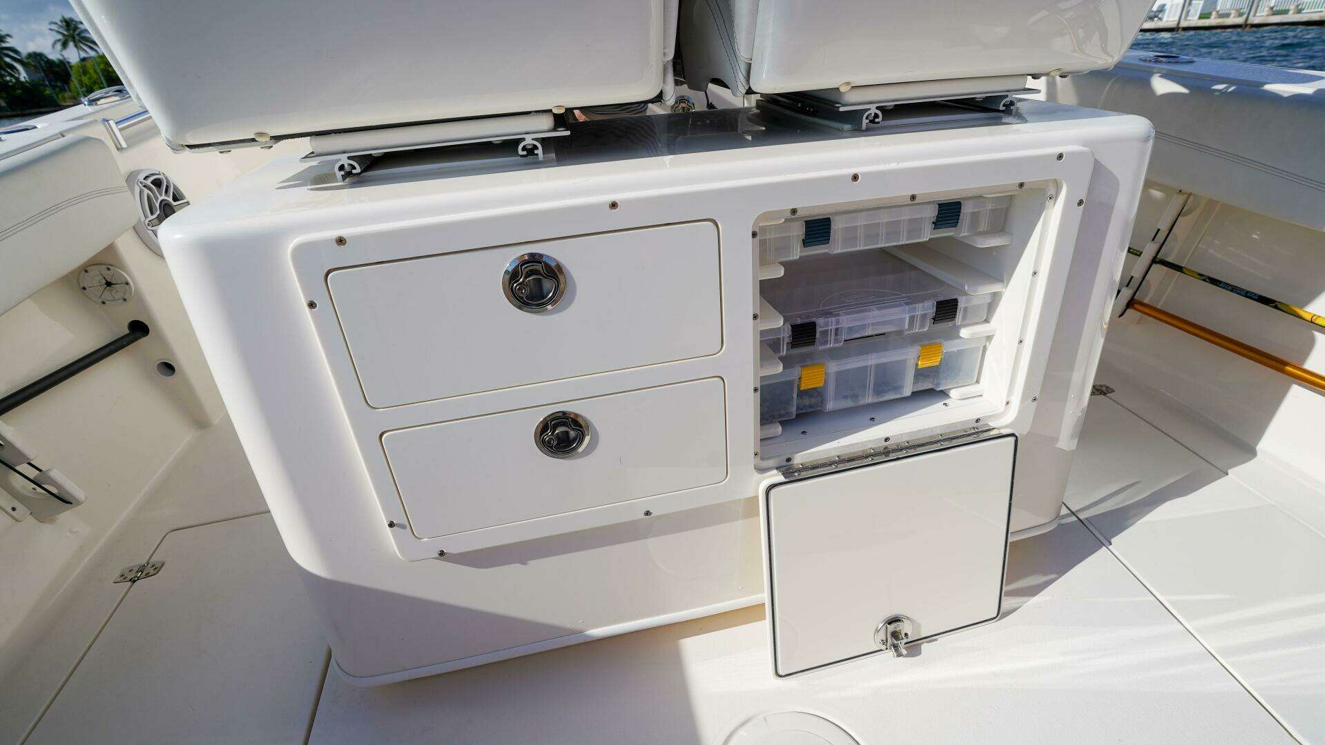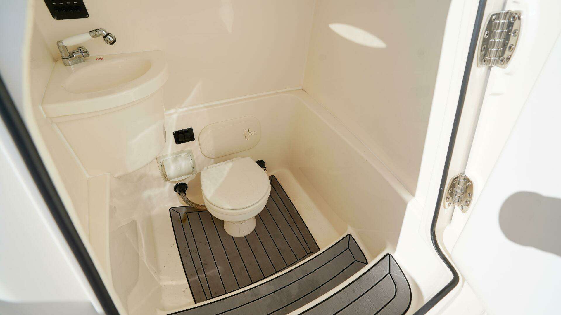 Access to the console interior is through a wide, side-hinged door at the helm. Inside, the surprisingly spacious compartment includes a marine head, freshwater sink, and additional storage. The headroom is ample, and the finish is clean and easy to maintain—excellent for family comfort during long outings.
