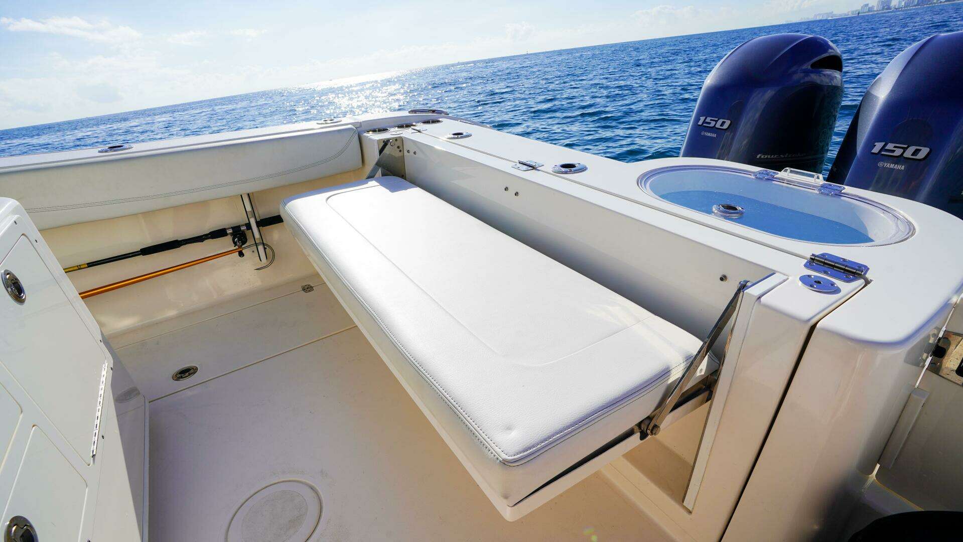 Walking back toward the stern, the layout remains open and easy to navigate thanks to the wide walkways and thoughtful placement of grab handles. The aft seating can fold away to provide more fishing room, or fold out to accommodate guests when cruising or anchored at the sandbar. Every inch of the deck feels solid underfoot—true to Cobia’s vacuum-infused construction—and the boat maintains a sense of confidence whether you’re preparing gear, hosting friends, or heading offshore.