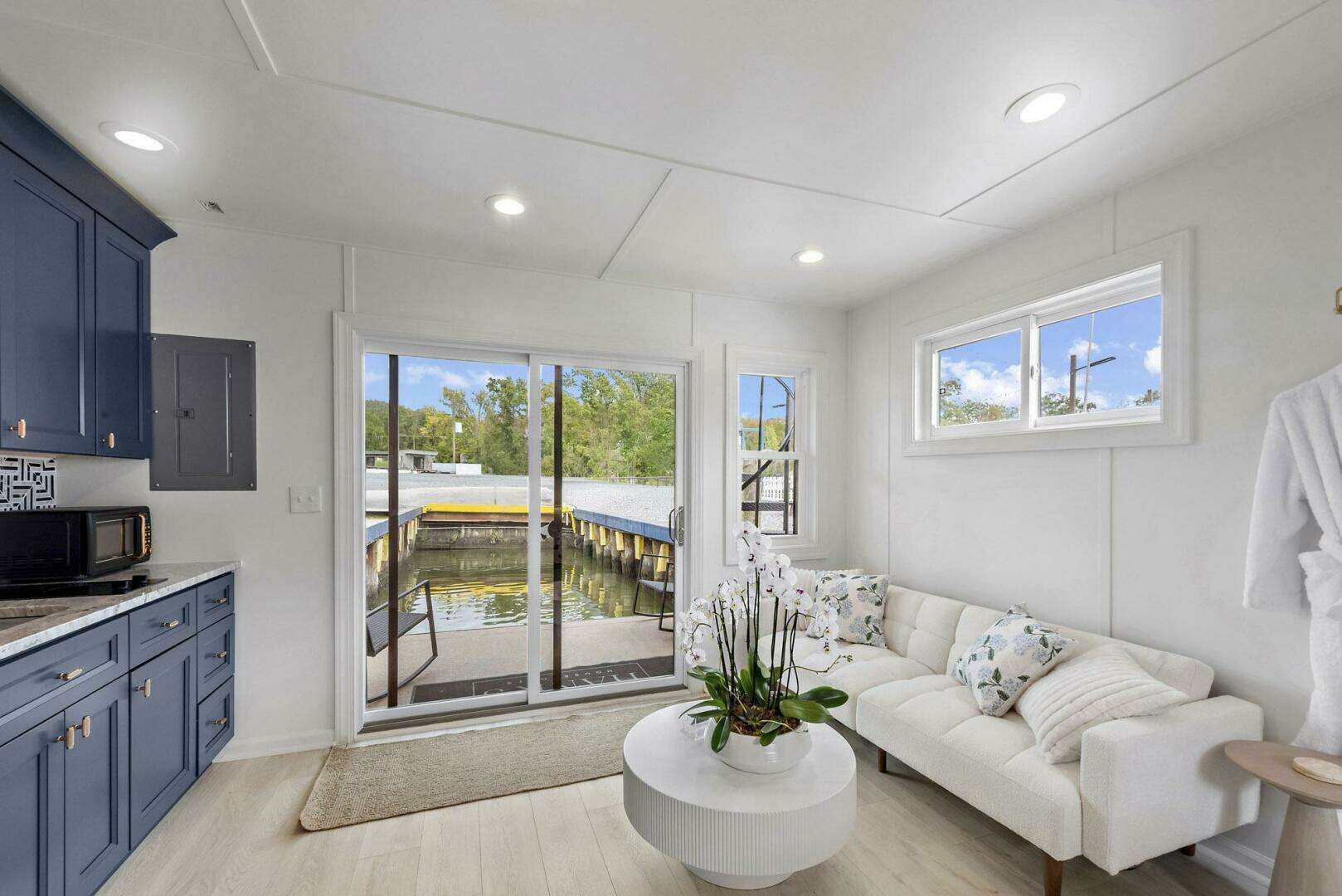 Inside, you’ll find a Queen-size bed, pull-out couch, full kitchen, and a thoughtful layout that comfortably accommodates 1–4 guests. Whether it’s a weekend getaway or a peaceful full-time liveaboard, each build can be customized to match your lifestyle — from cozy modern interiors to open, airy layouts designed for waterfront tranquility.