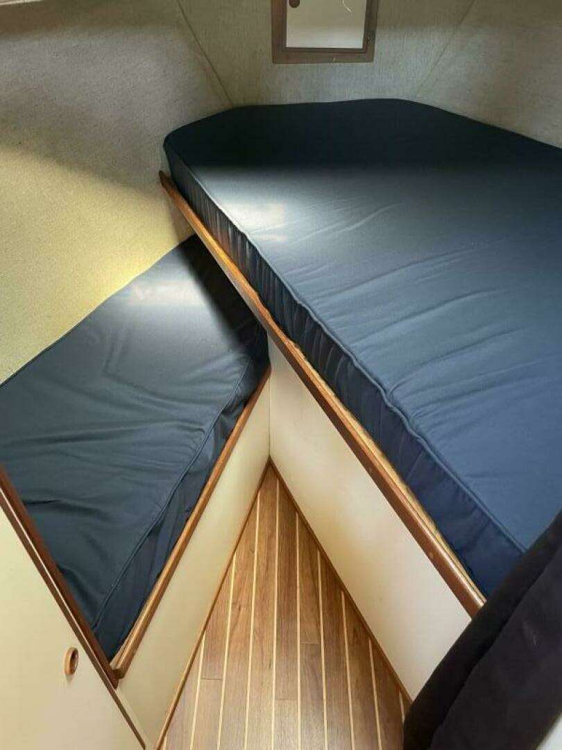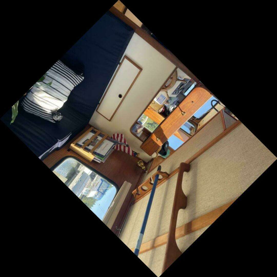 Once on board, you’ll find warm woodwork throughout, a little woodstove perfect for cozy mornings at anchor. New soft goods adorn the seats and V-berth, featuring memory foam, and a freshly upgraded galley equipped with a small fridge, propane stove with oven, a spacious pantry, new countertop, galley sink, and faucet.