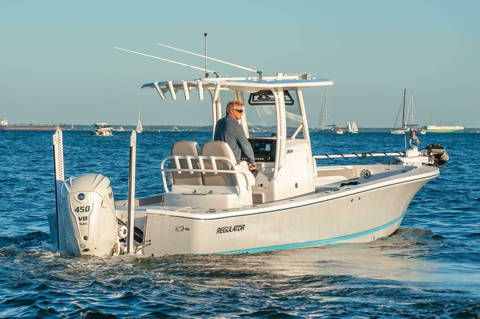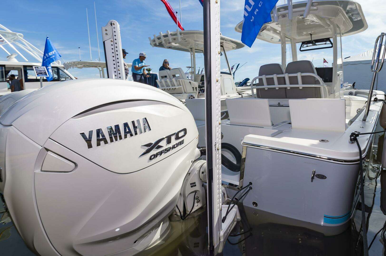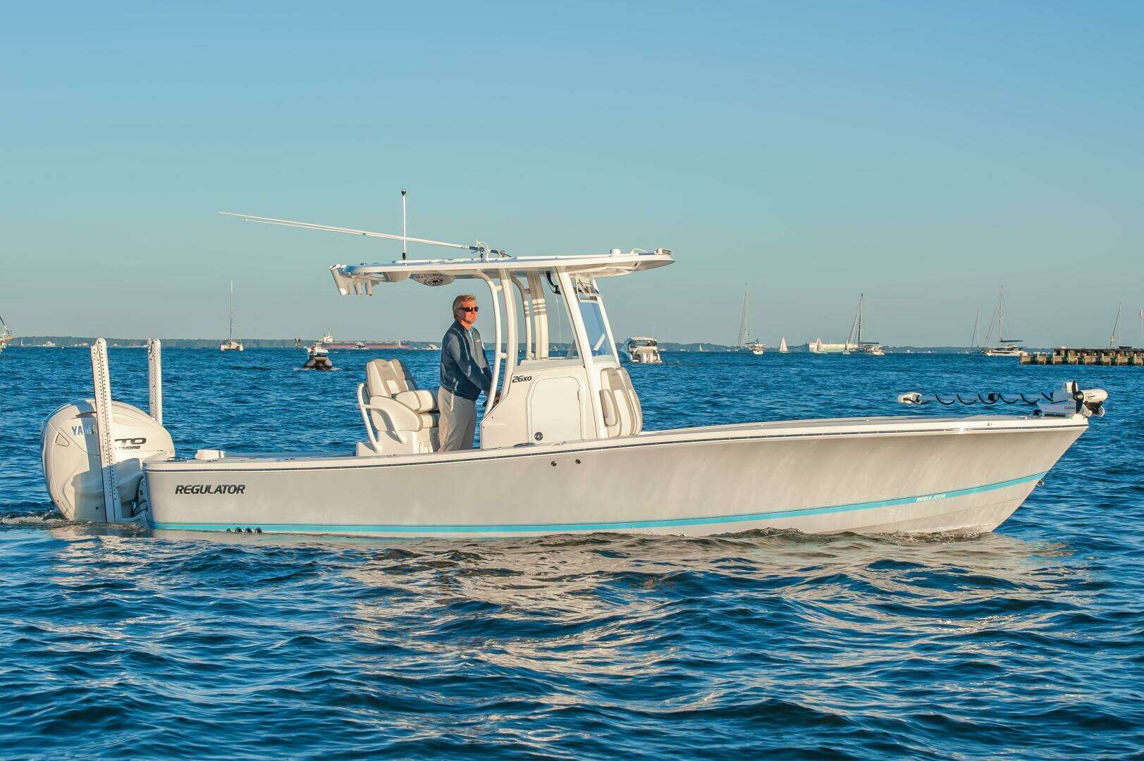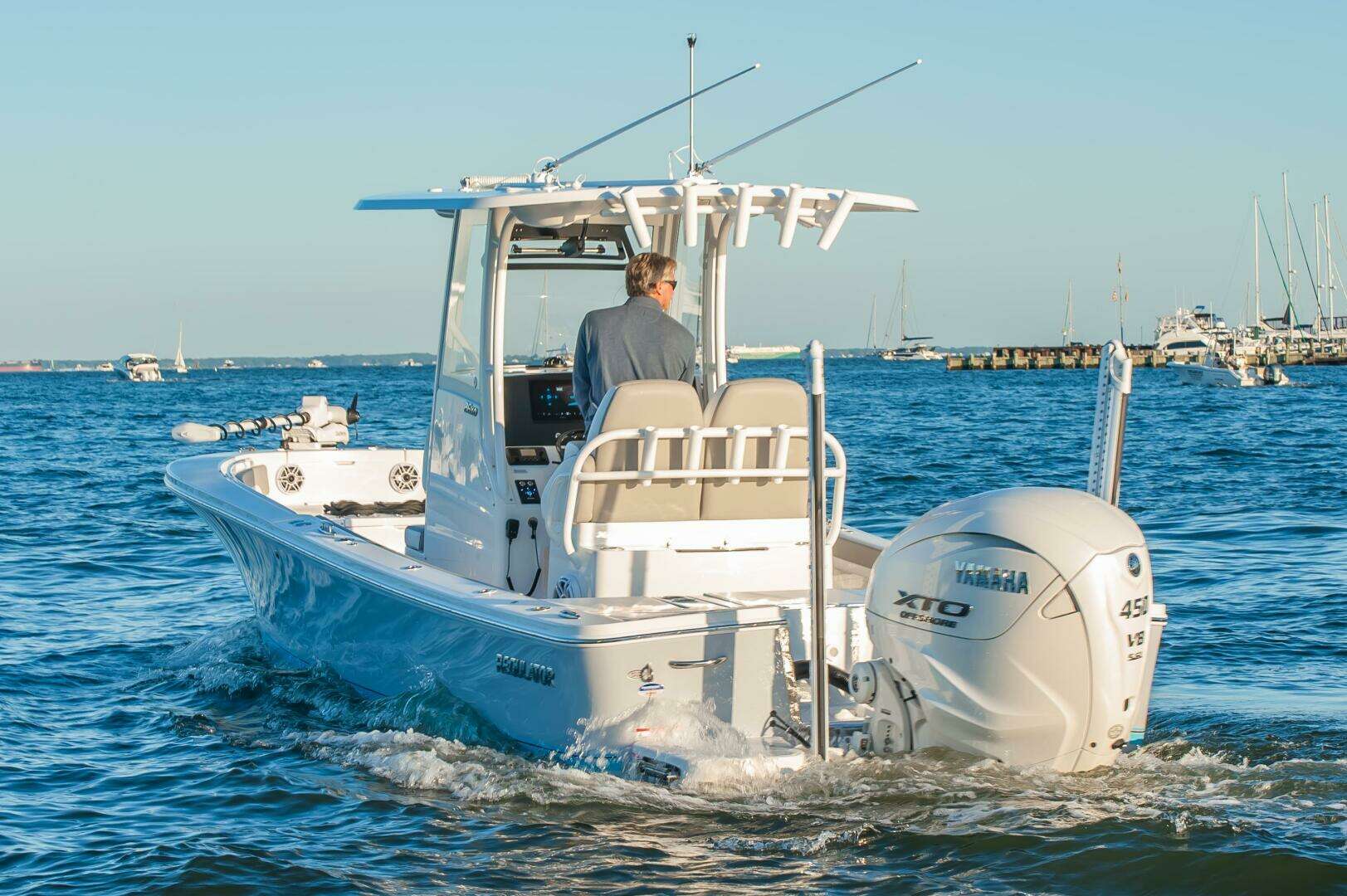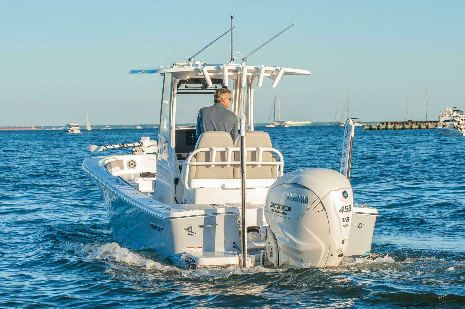 A hybrid center console built for adventure. New optional half tower, single Yamaha 450, multiple casting platforms, built-in coolers, stand-up head compartment, forward sunshade option, and optional removable watersports tow bar allow you to fish and play all day.