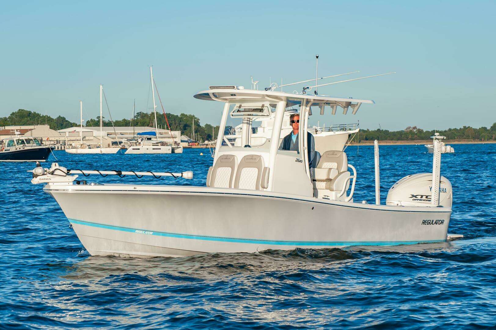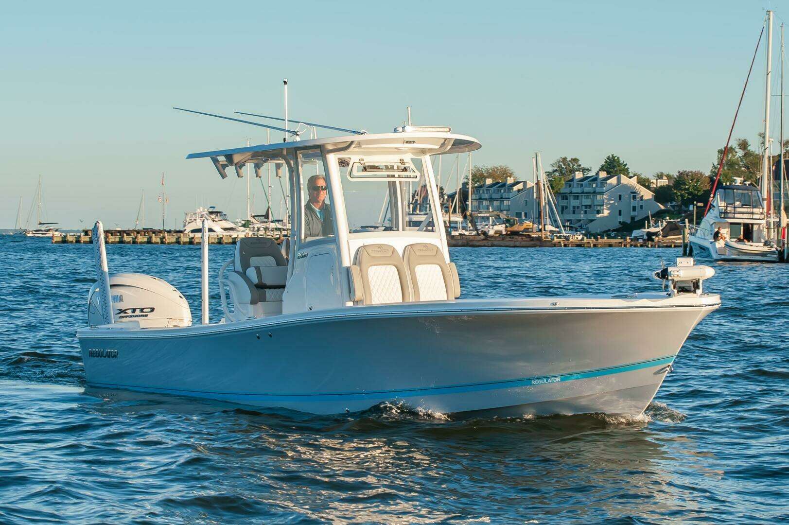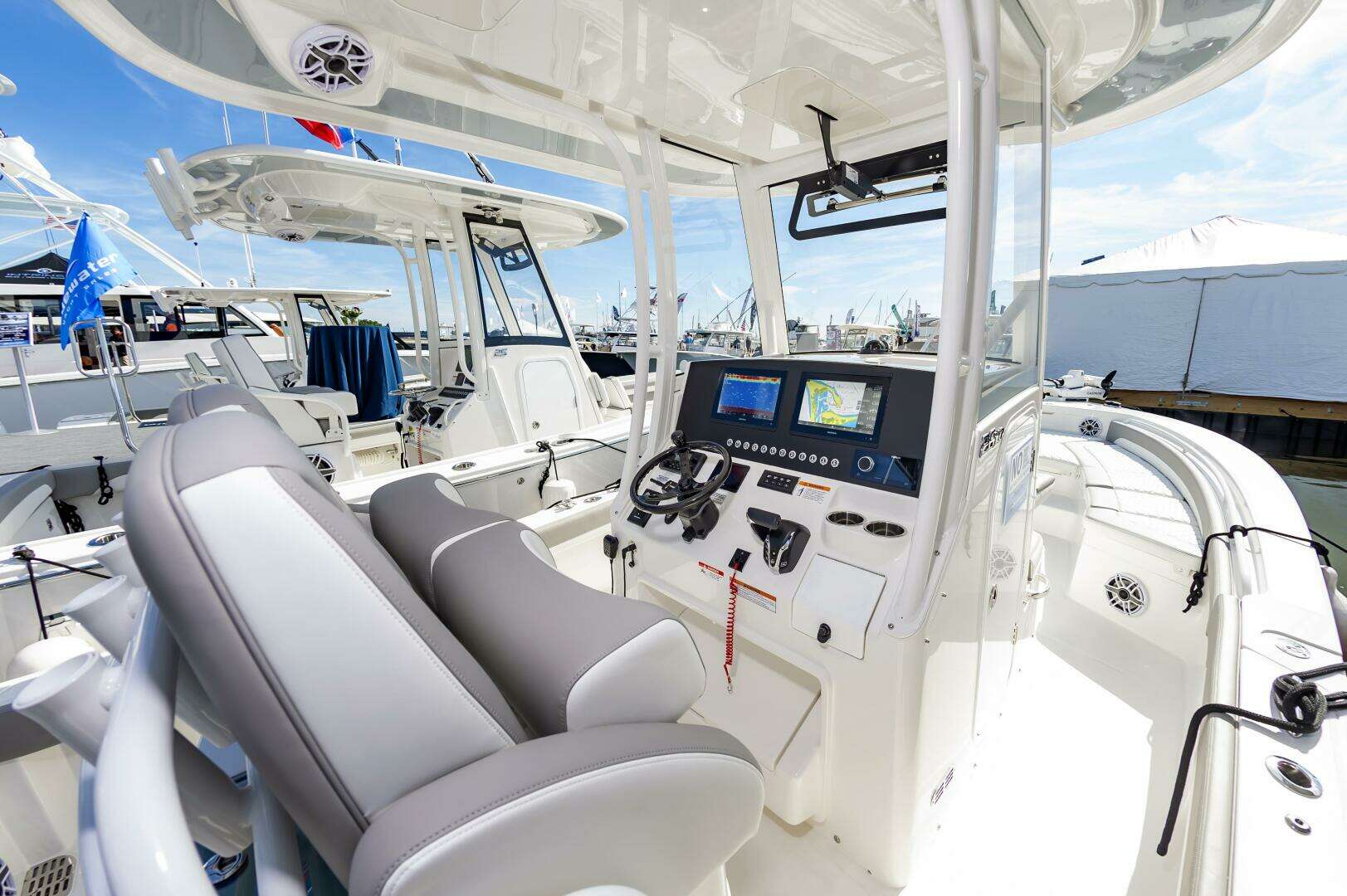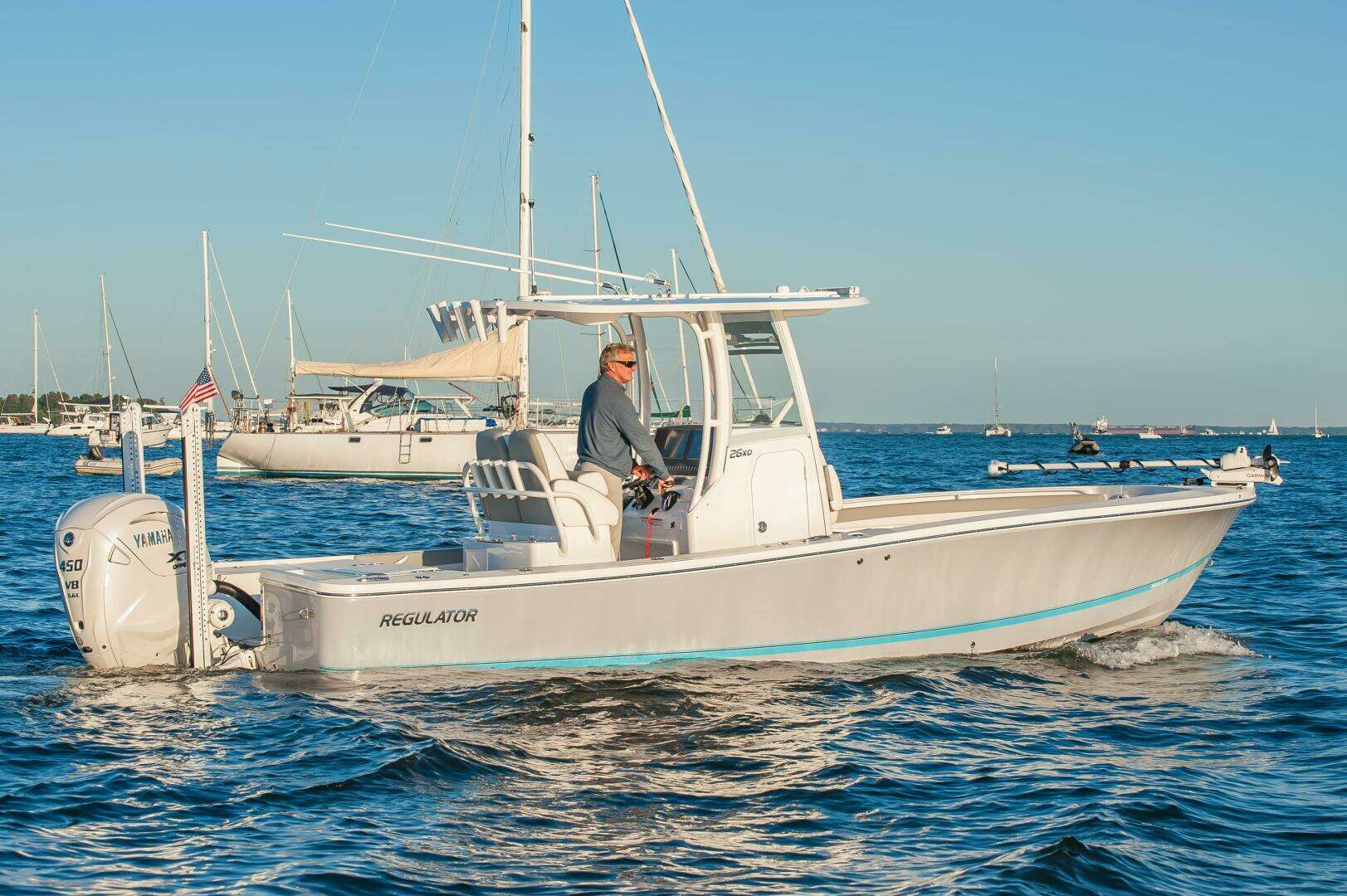 A hybrid center console built for adventure. New optional half tower, single Yamaha 450, multiple casting platforms, built-in coolers, stand-up head compartment, forward sunshade option, and optional removable watersports tow bar allow you to fish and play all day.