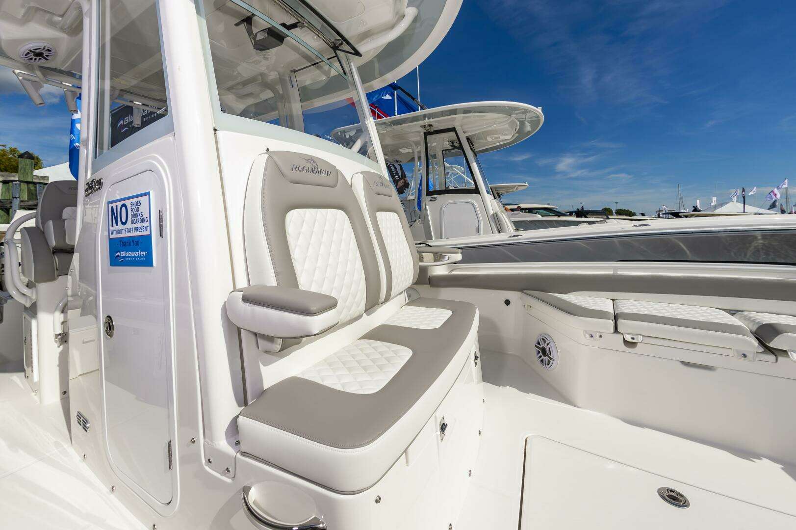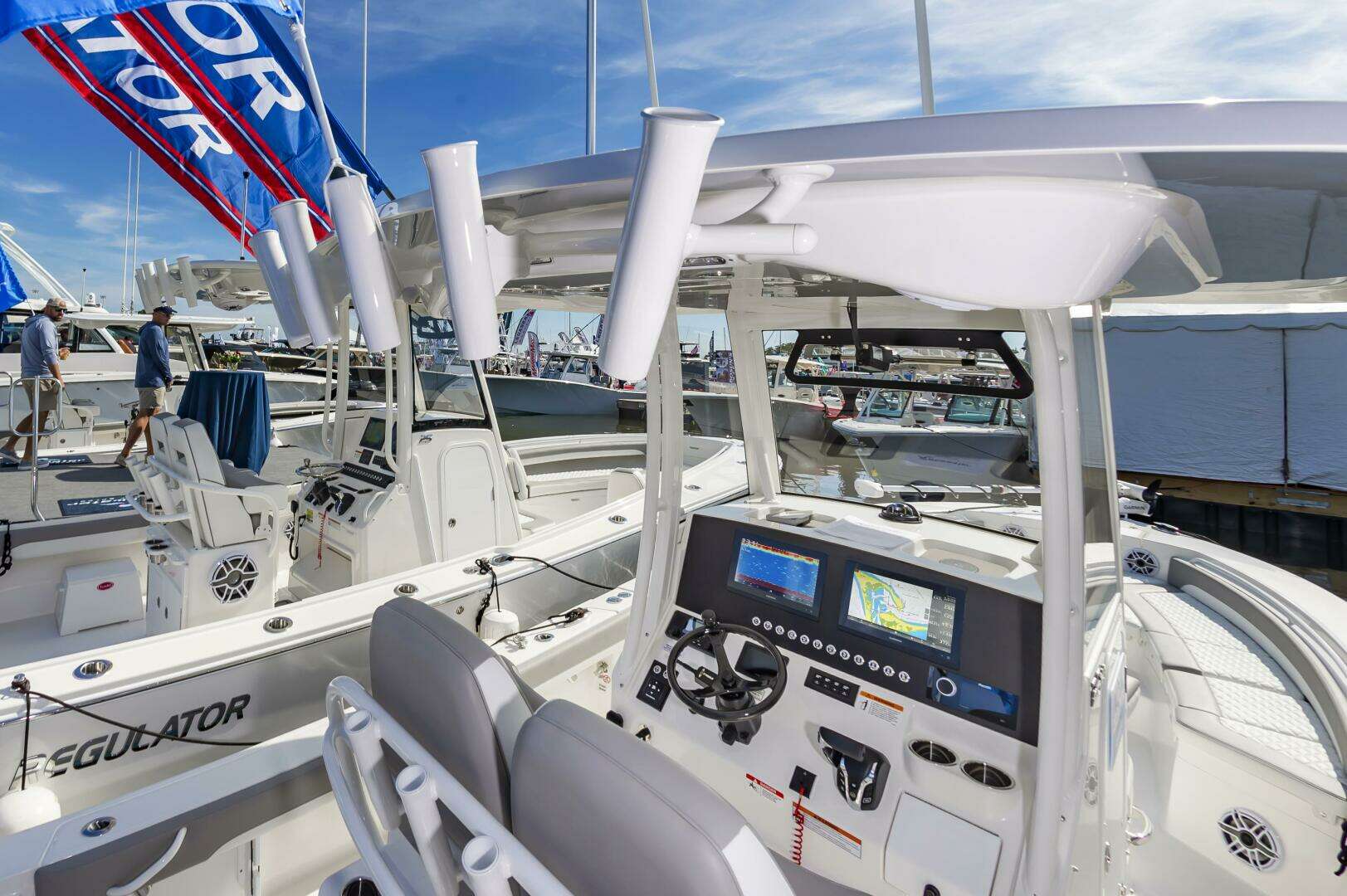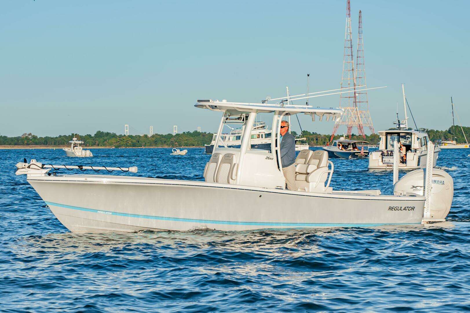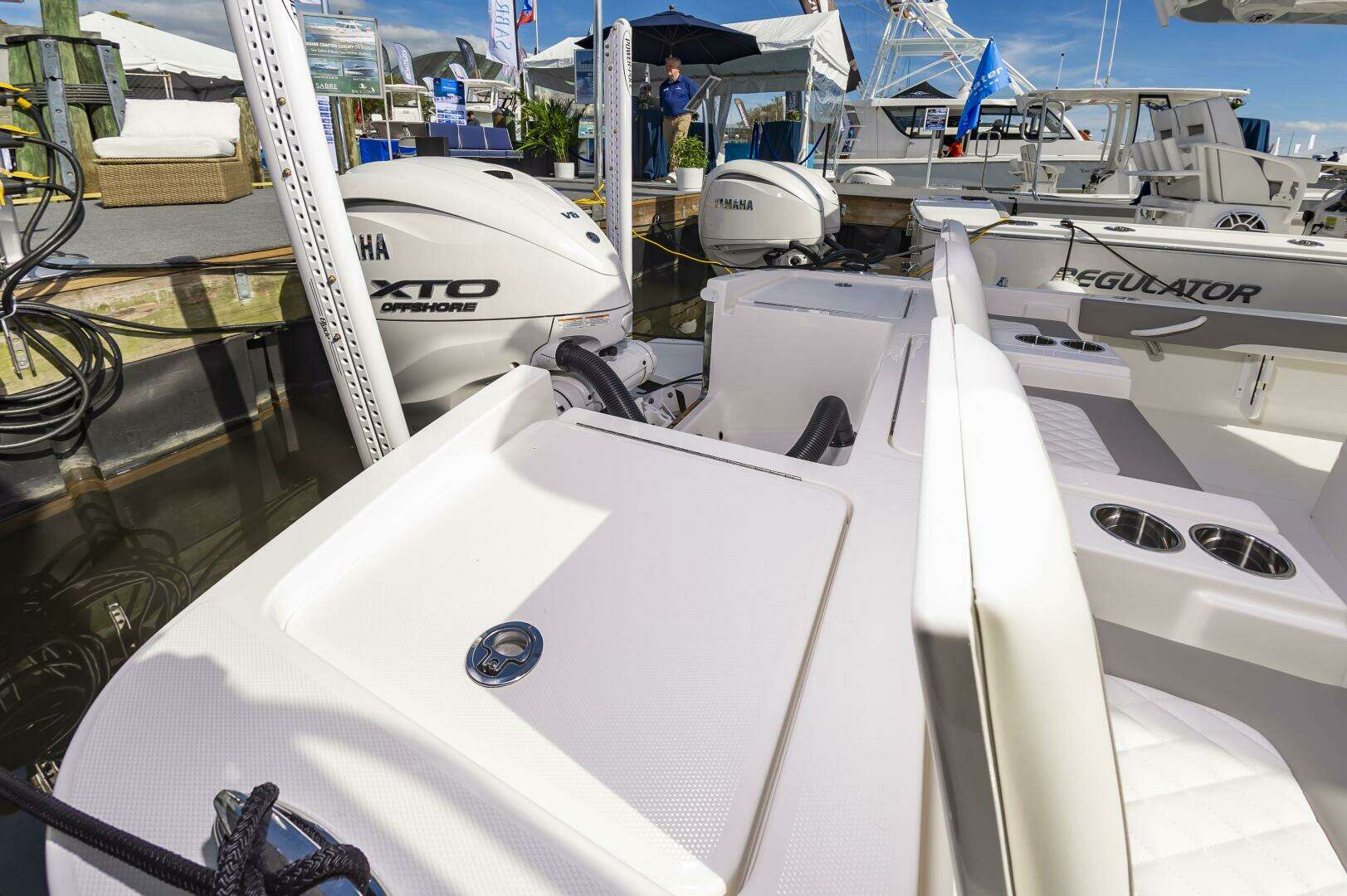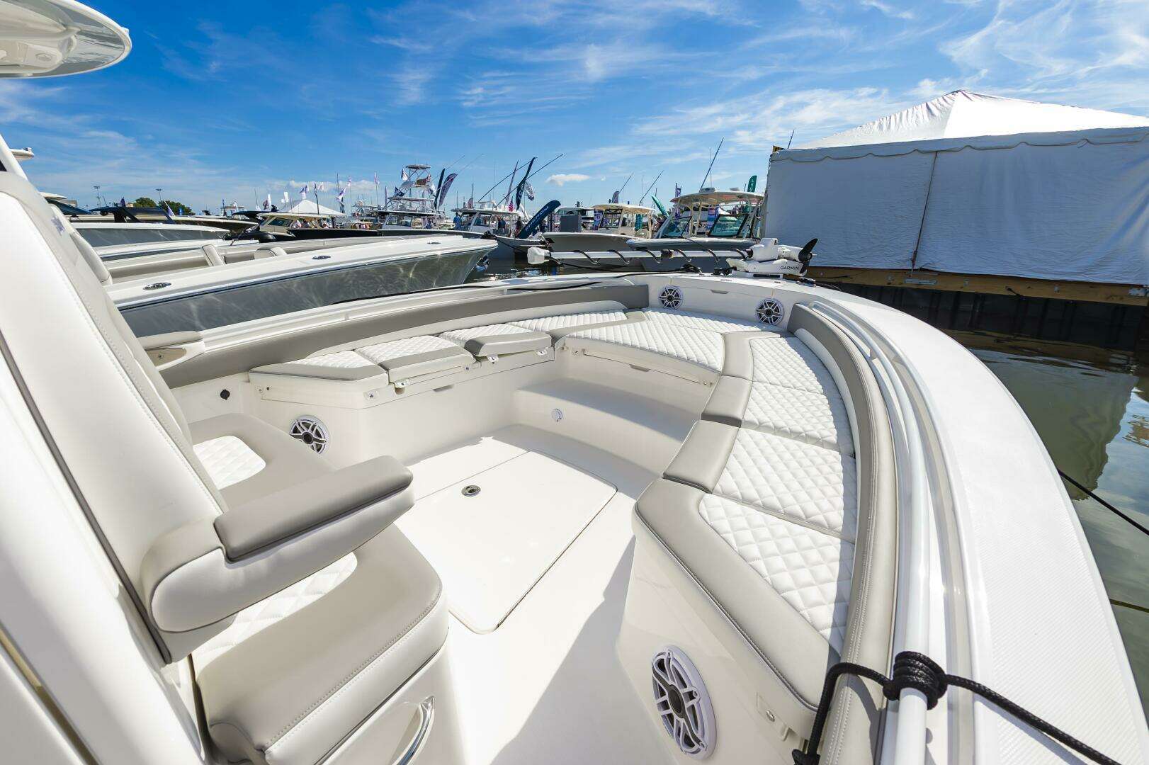 A hybrid center console built for adventure. New optional half tower, single Yamaha 450, multiple casting platforms, built-in coolers, stand-up head compartment, forward sunshade option, and optional removable watersports tow bar allow you to fish and play all day.