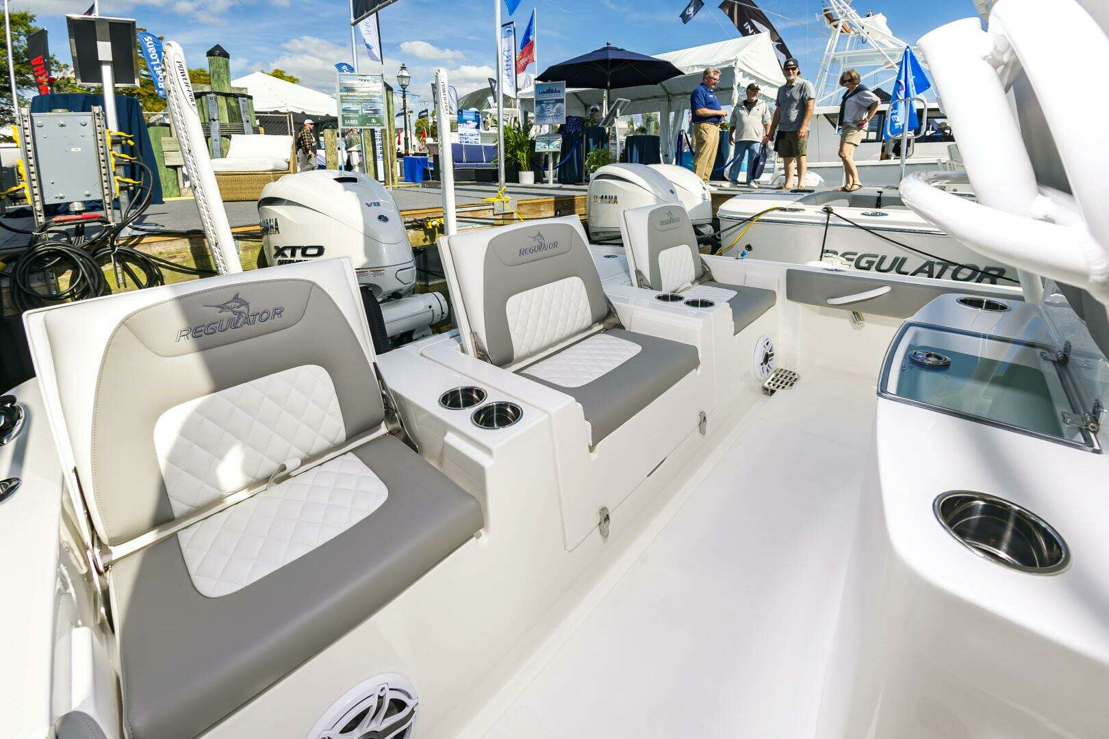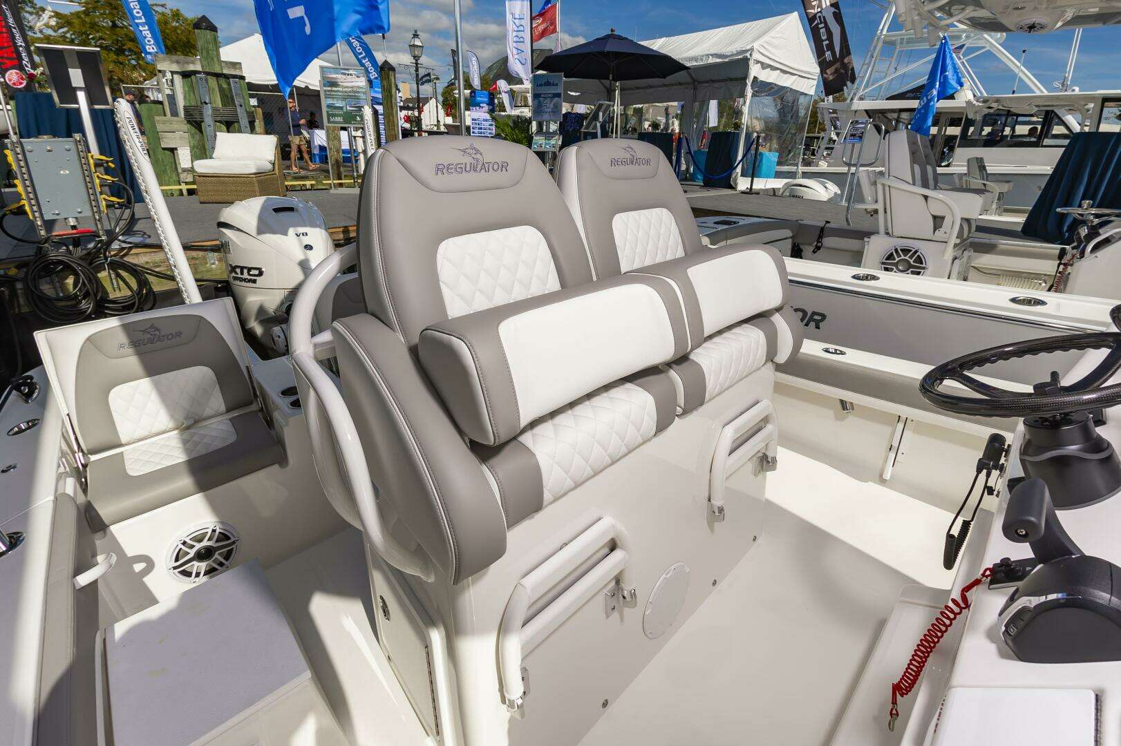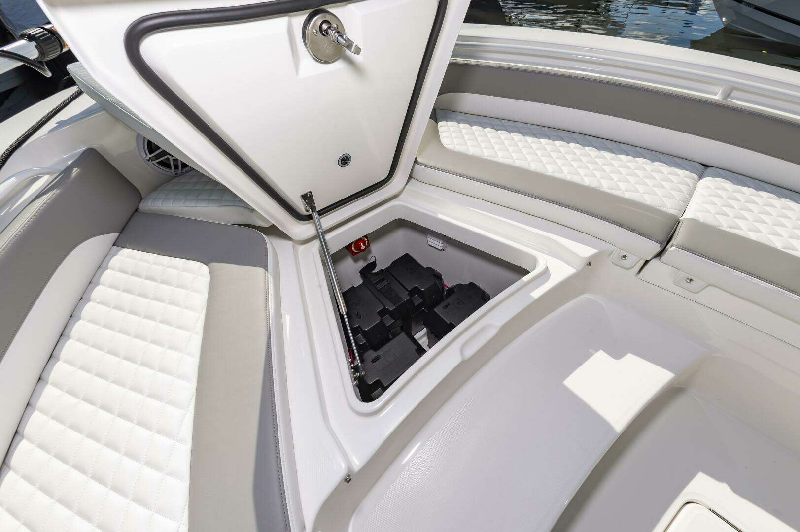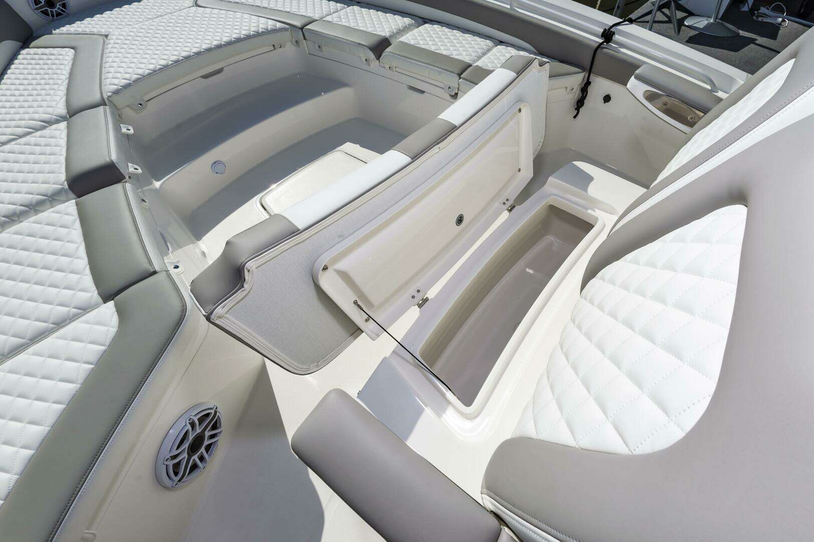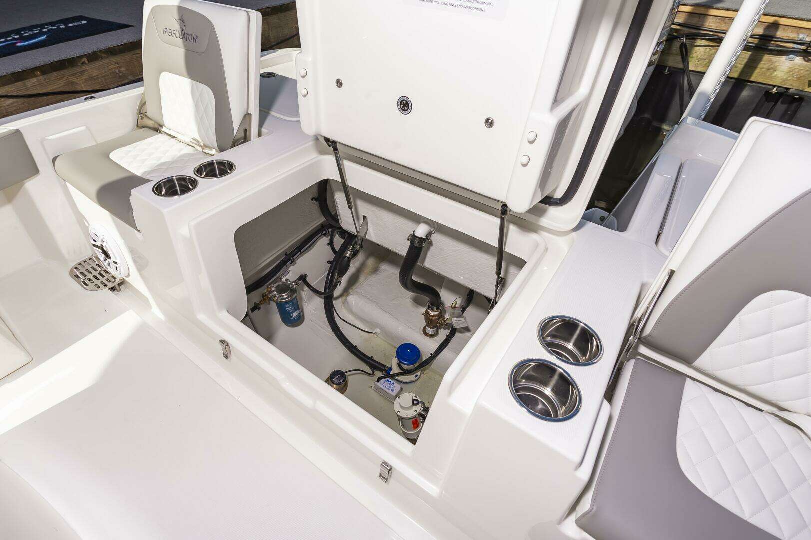 - Deluxe Tackle Center with Upholstered Helm Seating for Two with Flip-up Bolster, Individual Footrests, (4) Seatback Rocket Launchers, (2) Cup Holders, 32 gal. Livewell, and Tackle Storage