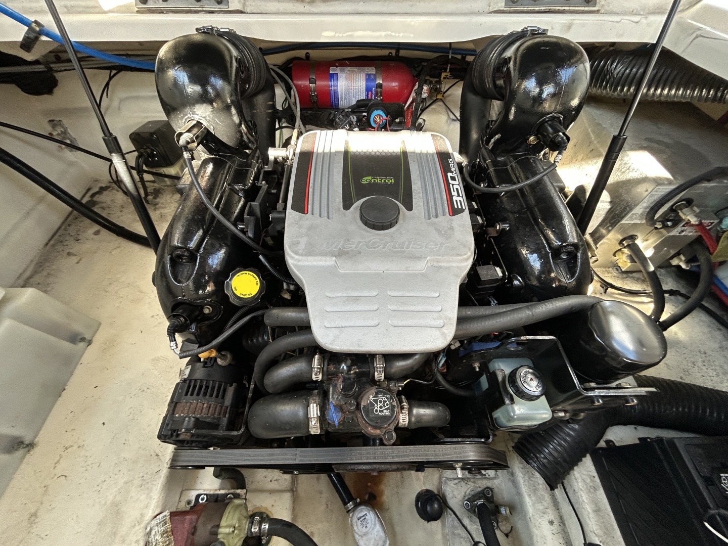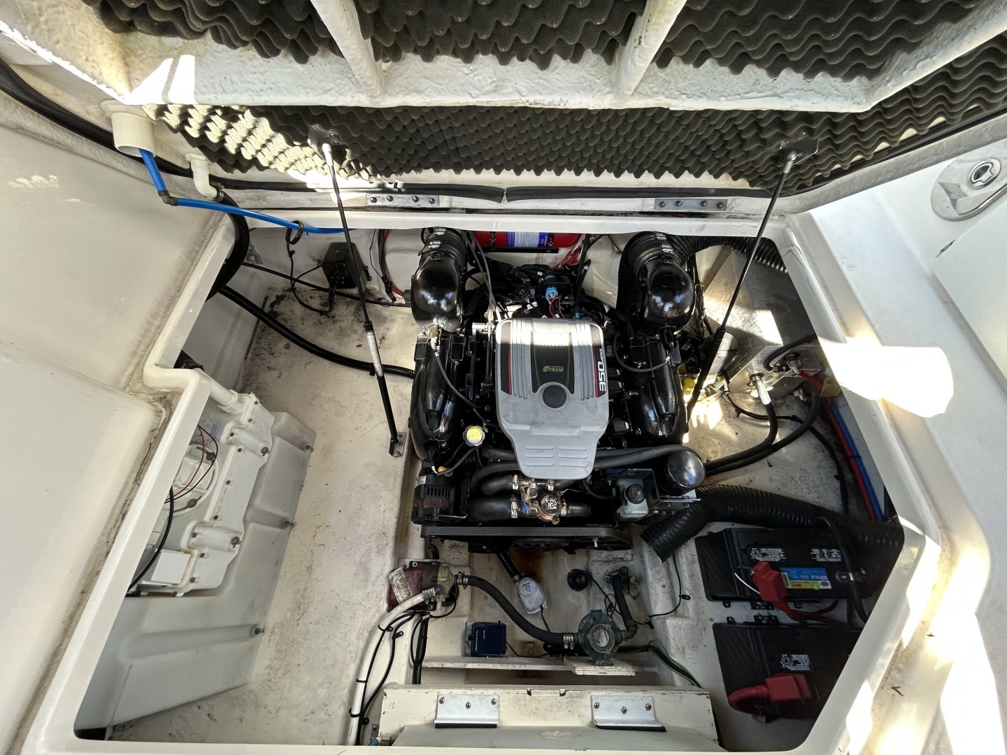 The 2014 Sea Ray 260 Sundancer is a 26' 7" express cruiser designed for overnighting and day boating, featuring an 8' 6" beam and a dry weight around 5,500–6,950 lbs. Common power options include a single MerCruiser 350 MAG Bravo III 5.0L MPI (260) sterndrive. It features a comfortable ca