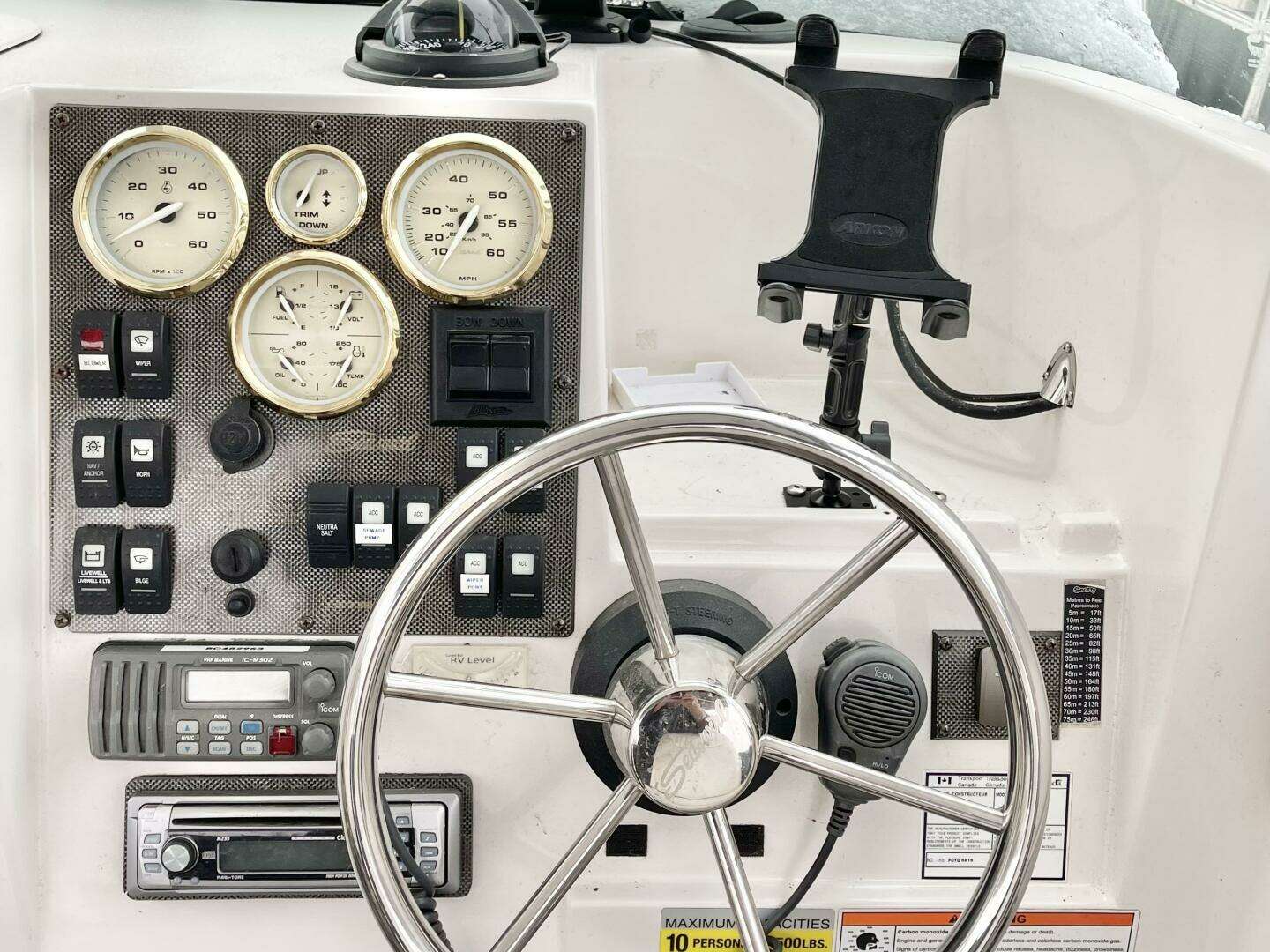 Power comes from a reliable Volvo 5.7L OSI (320 hp, 620 hrs) paired with a 2014 Volvo Penta Ocean X duo-prop stern drive—a premium setup that delivers speed, efficiency, and confidence. The risers and manifolds were replaced in April 2020, and full service records dating back to 2009 are included.