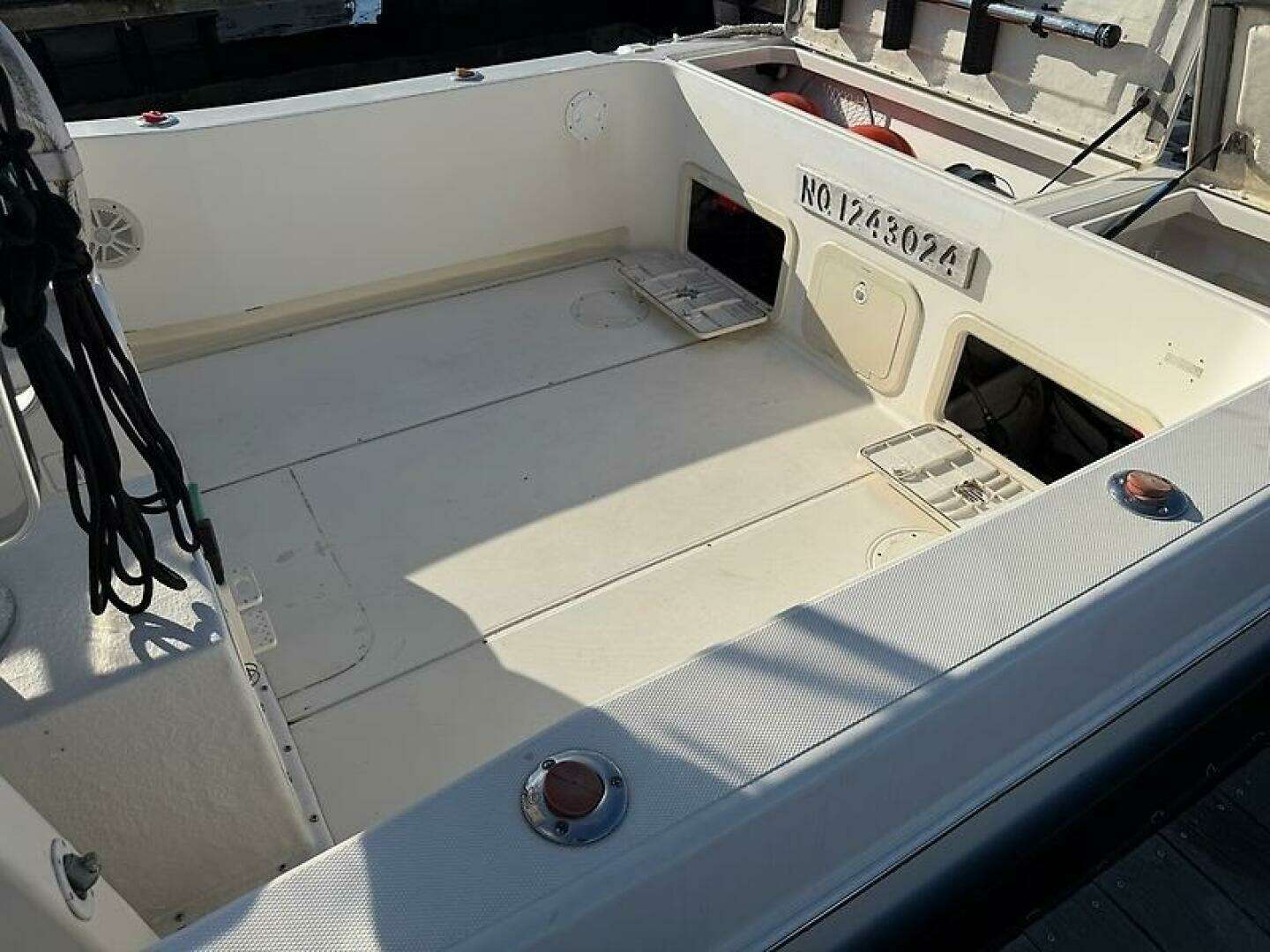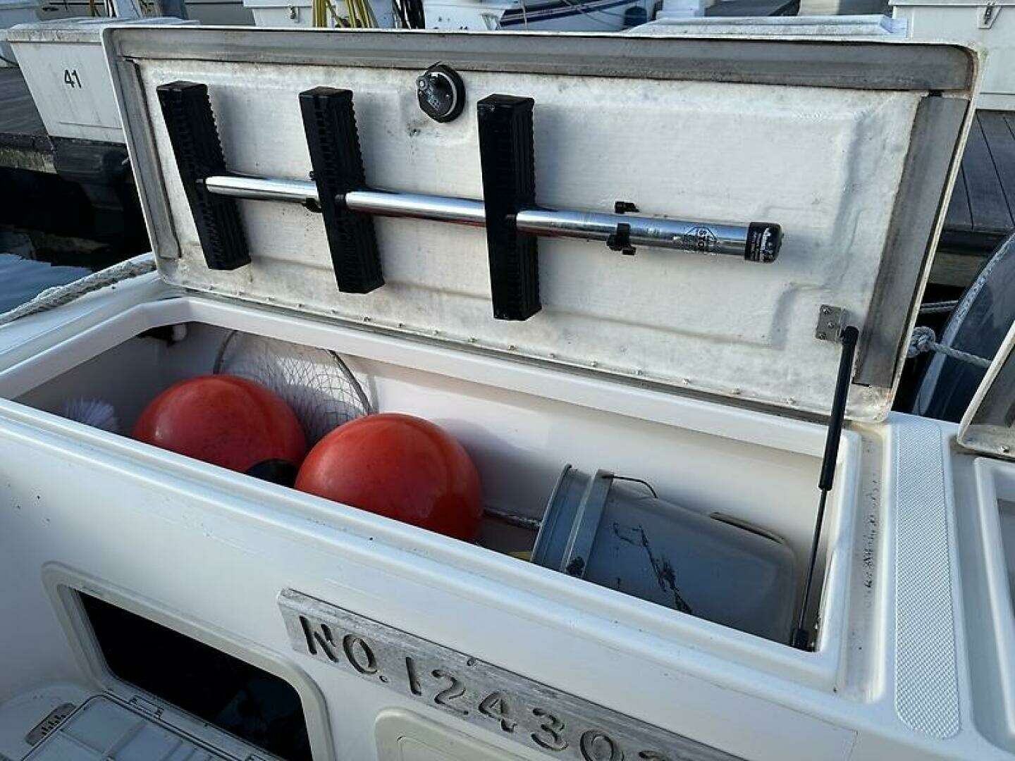 - Uncluttered cockpit features a large transom fishbox and livewell that conveniently gravity-drain overboard.