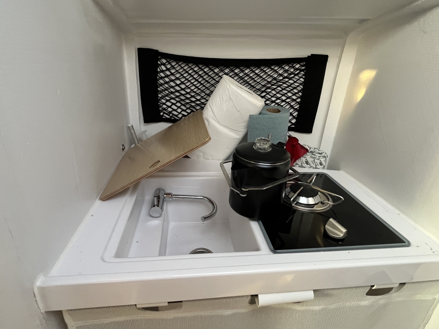 Sink basin with pressurized water + folding faucet