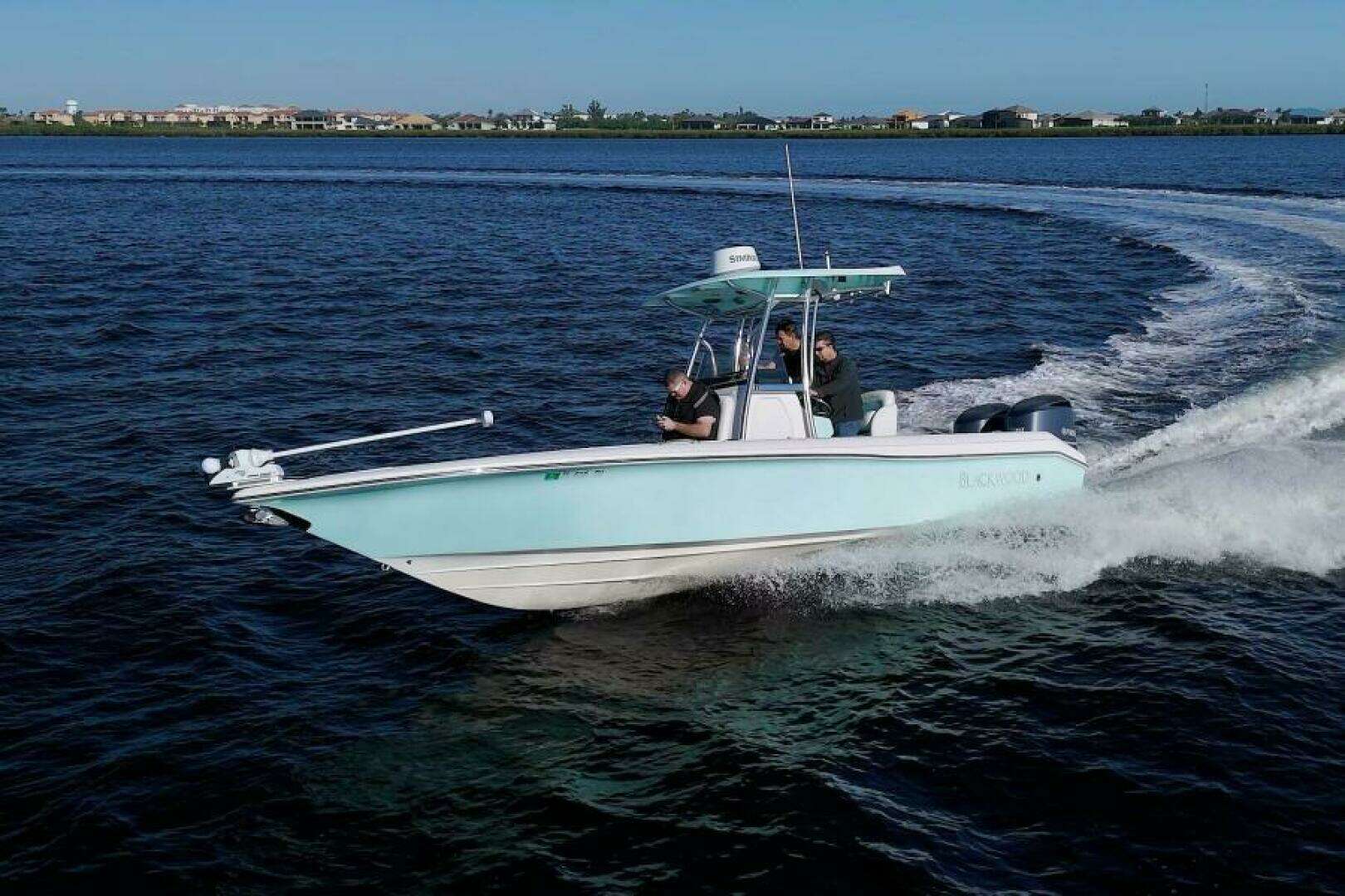 Blackwood boats deliver on product refinement. The 27' Offshore features sleek styling, luxurious Sky Blue and cream cushions, and upgraded padding. With a performance V hull, twin 300 Yamahas, and a 130-gallon fuel tank, it excels in speed and versatility.