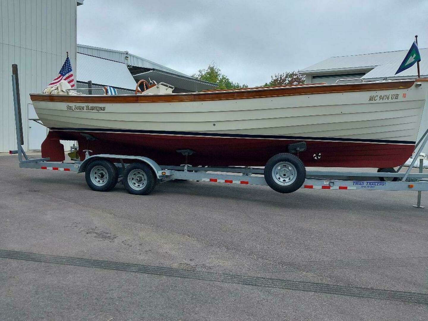 - Hull: Traditional lapstrake-style fiberglass with varnished mahogany trim