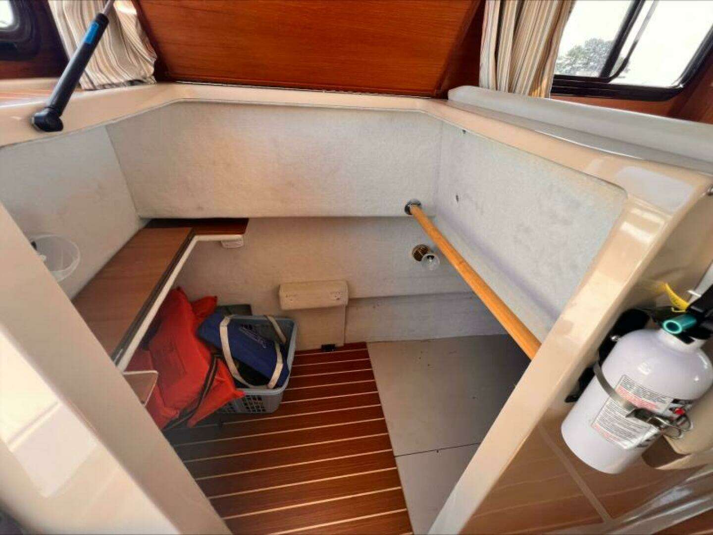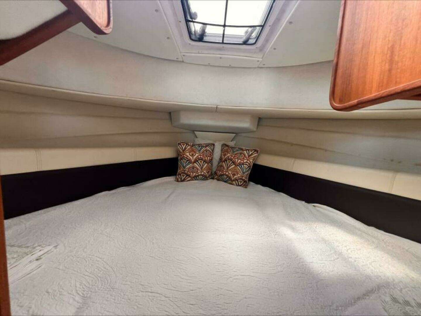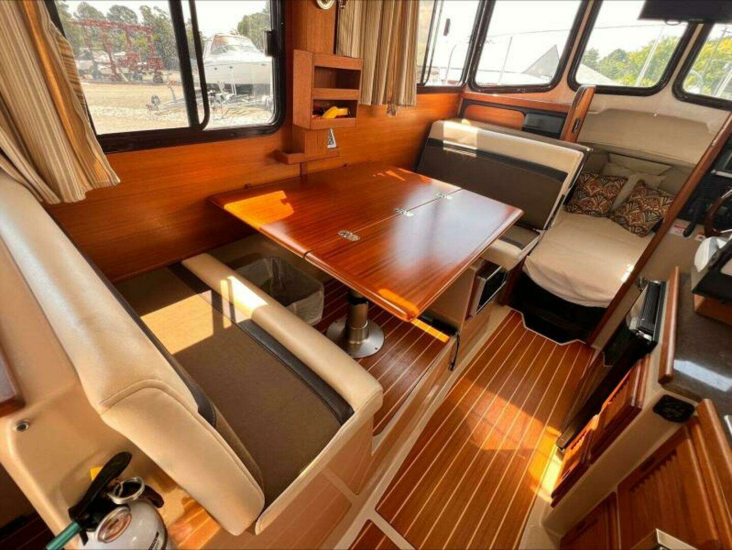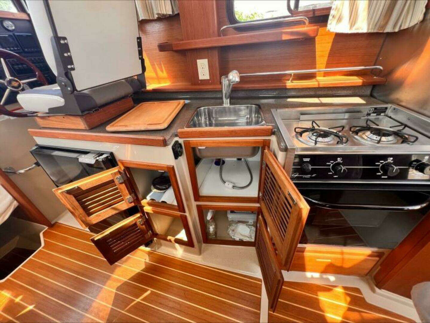 The R-27 has nearly 50 Sq ft of aft deck space allowing for easy access to the standard 200 HP Volvo diesel while keeping engine noise out of the cabin. The well appointed cabin has a midship office with desk and seat, this space also converts to a berth that sleeps two. The dinette table is on a hydraulic piston that allows for an easy conversion to a berth or lounging area. The spacious front v-berth sleeps two adults and is over 6'5" in length. Cooks will love the standard galley which includes a sink, refrigerator, inverter, microwave and a combination propane stove/oven. The marine head is standard with an electric flush toilet, glass vessel sink and shower.