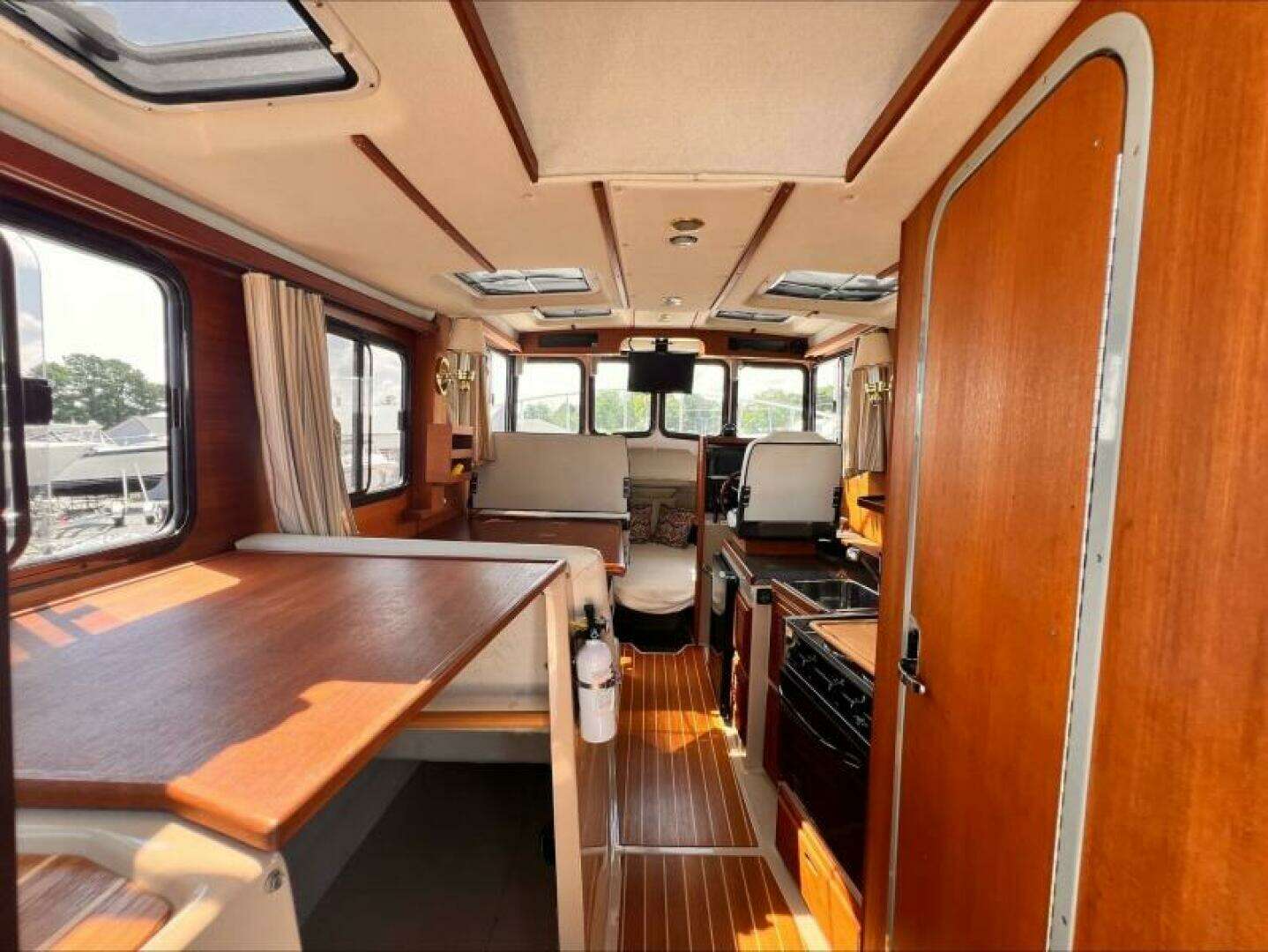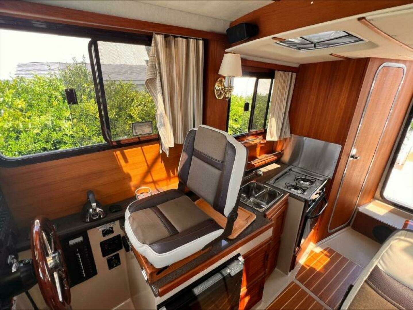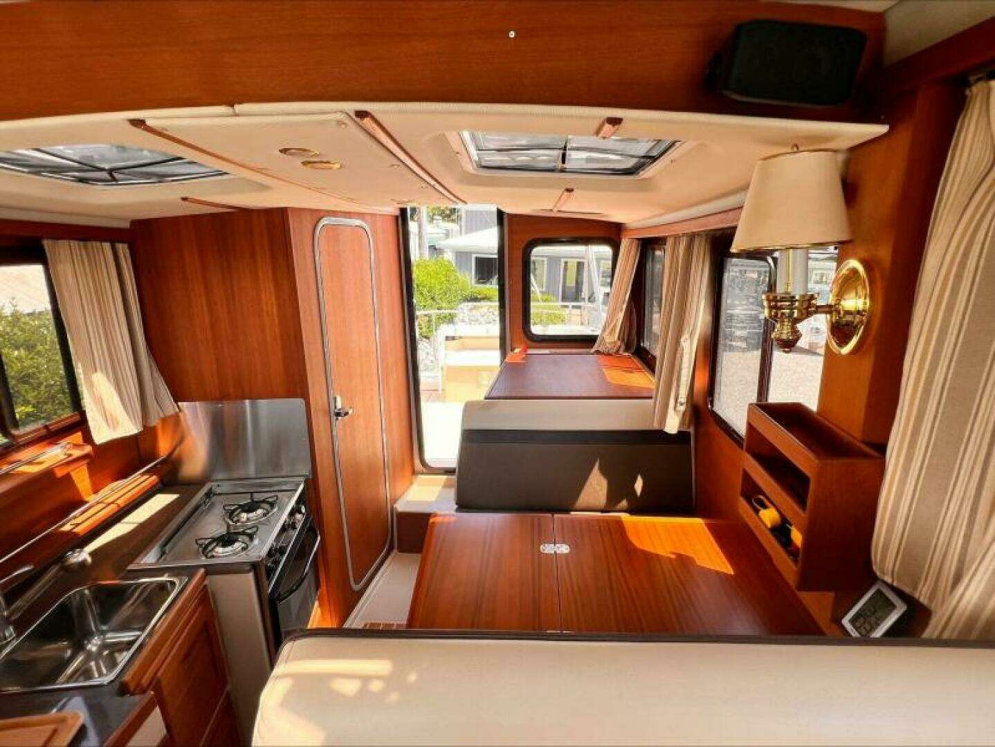 The R-27 has nearly 50 Sq ft of aft deck space allowing for easy access to the standard 200 HP Volvo diesel while keeping engine noise out of the cabin. The well appointed cabin has a midship office with desk and seat, this space also converts to a berth that sleeps two. The dinette table is on a hydraulic piston that allows for an easy conversion to a berth or lounging area. The spacious front v-berth sleeps two adults and is over 6'5" in length. Cooks will love the standard galley which includes a sink, refrigerator, inverter, microwave and a combination propane stove/oven. The marine head is standard with an electric flush toilet, glass vessel sink and shower.