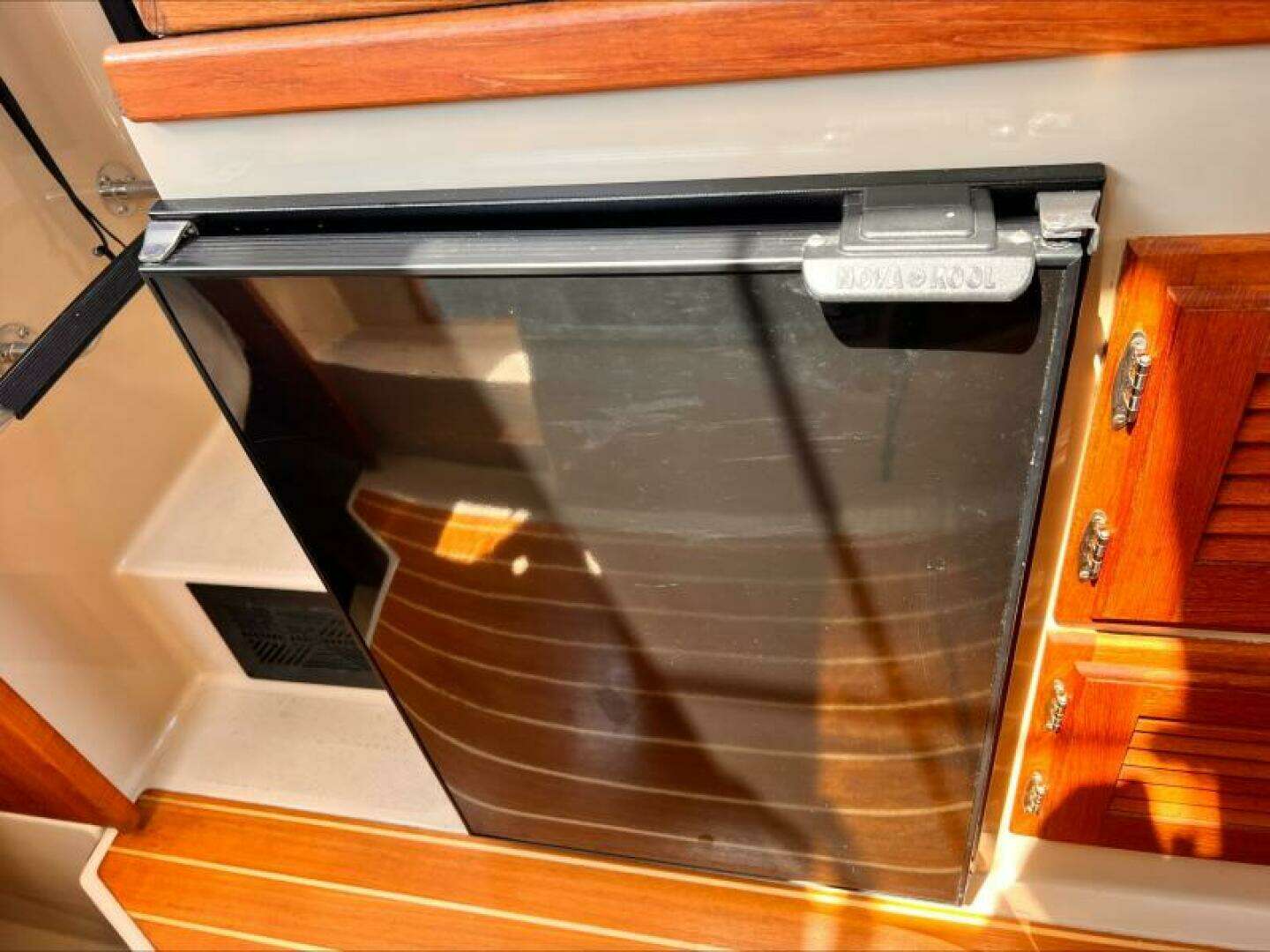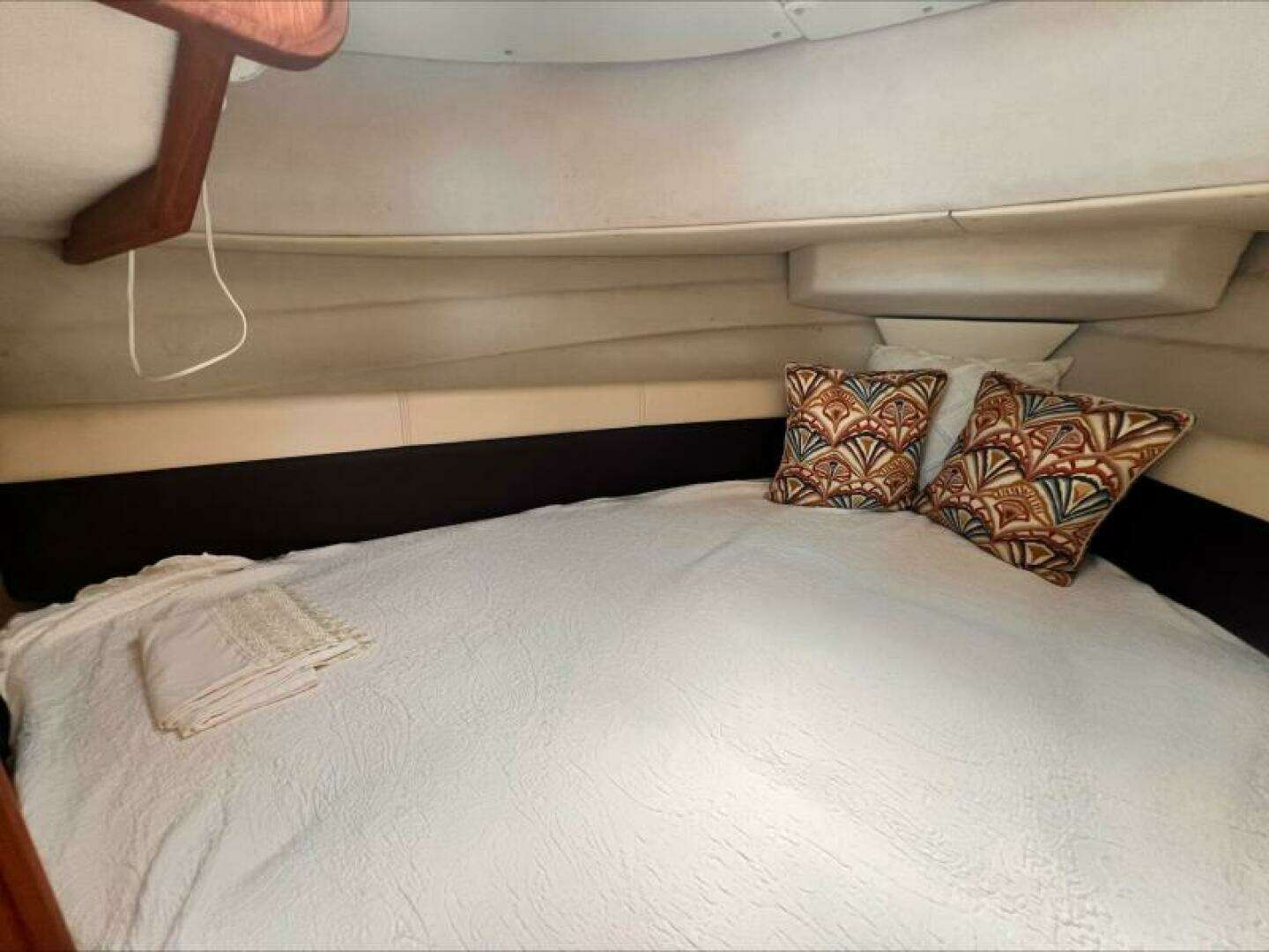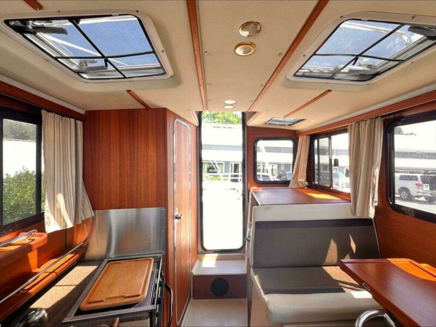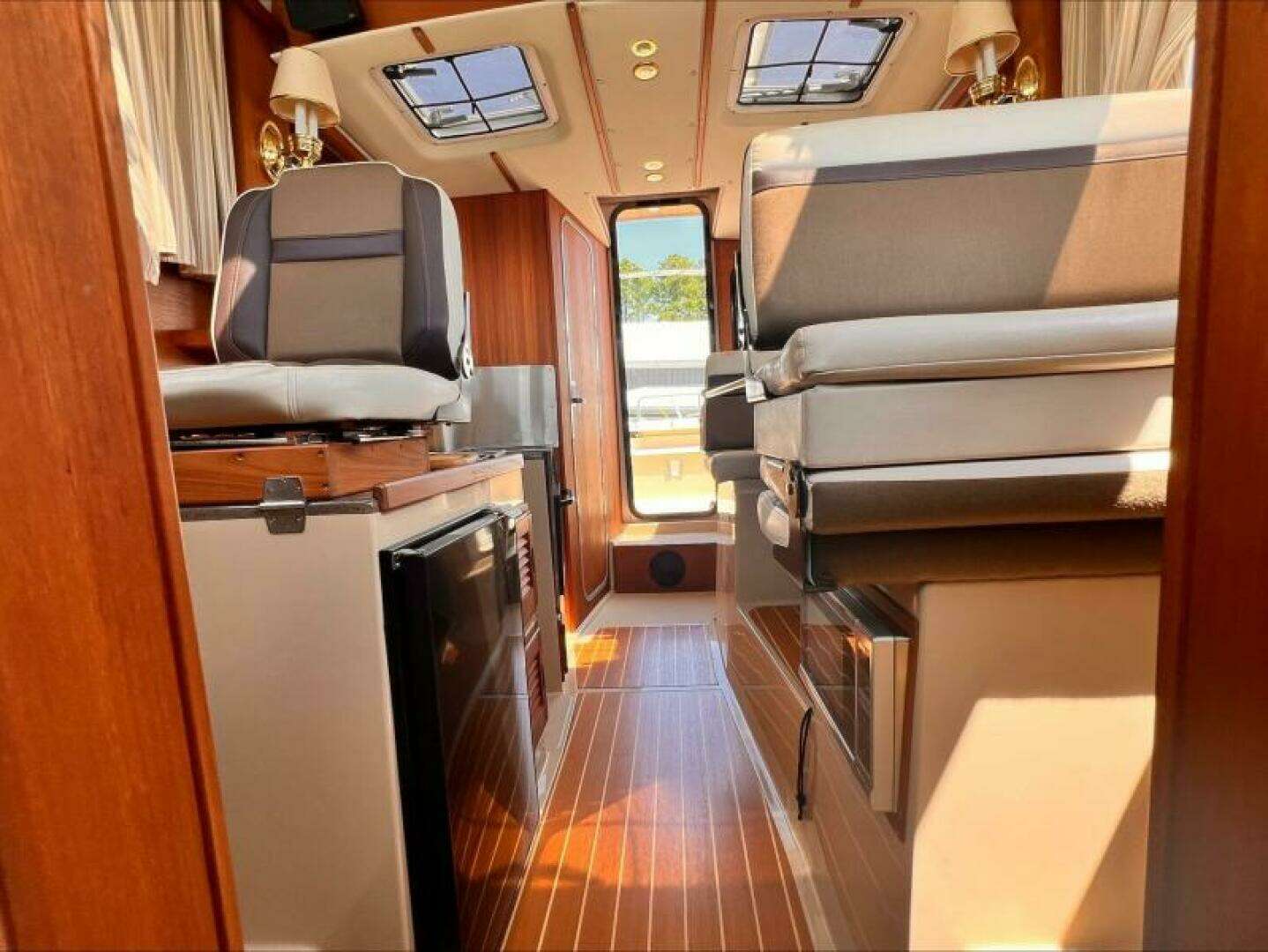 The R-27 has nearly 50 Sq ft of aft deck space allowing for easy access to the standard 200 HP Volvo diesel while keeping engine noise out of the cabin. The well appointed cabin has a midship office with desk and seat, this space also converts to a berth that sleeps two. The dinette table is on a hydraulic piston that allows for an easy conversion to a berth or lounging area. The spacious front v-berth sleeps two adults and is over 6'5" in length. Cooks will love the standard galley which includes a sink, refrigerator, inverter, microwave and a combination propane stove/oven. The marine head is standard with an electric flush toilet, glass vessel sink and shower.