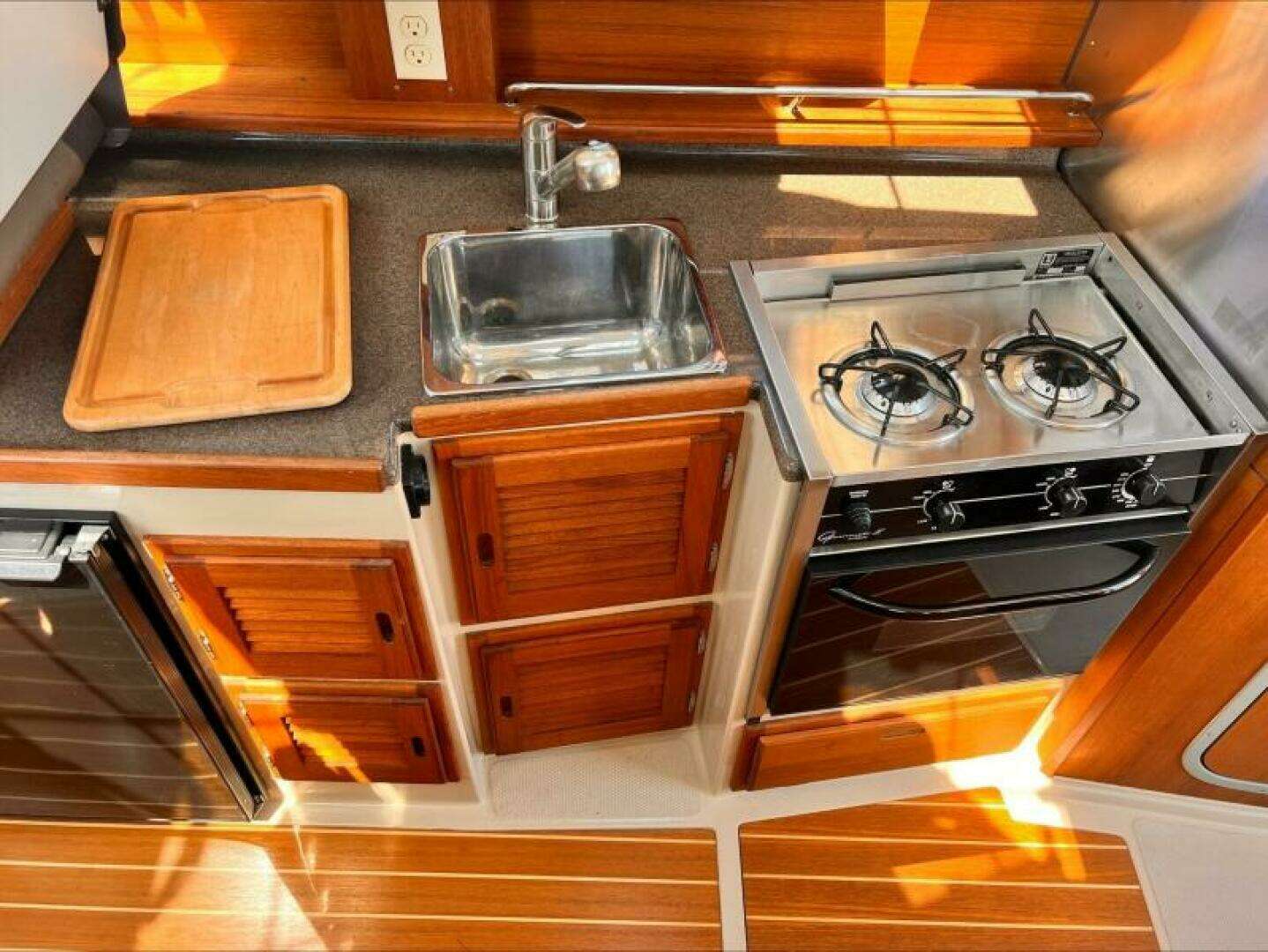 - Seward stove and oven, propane with twin tanks and storage (tanks and storage box currently removed for more room on swim platform but do convey)