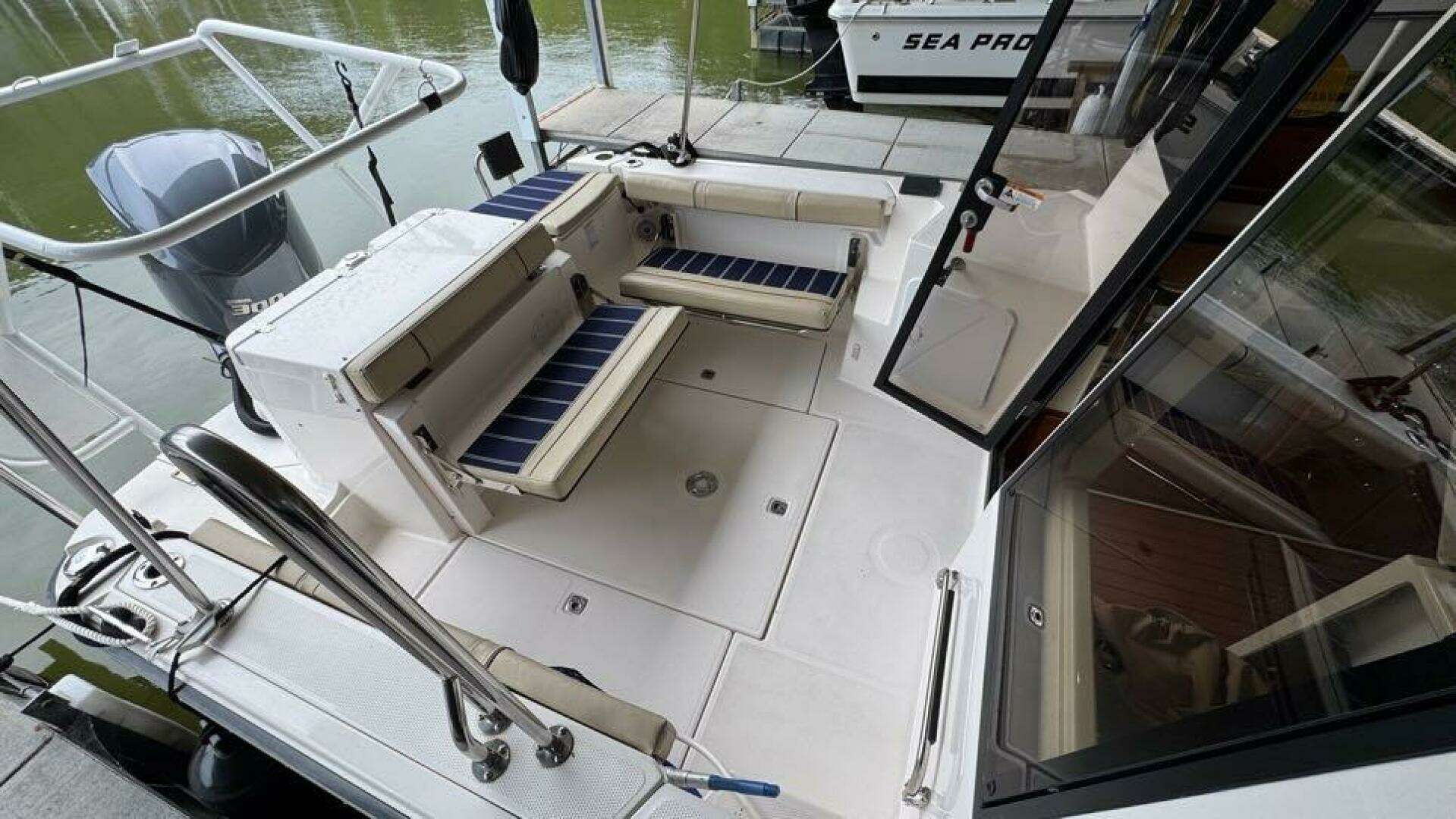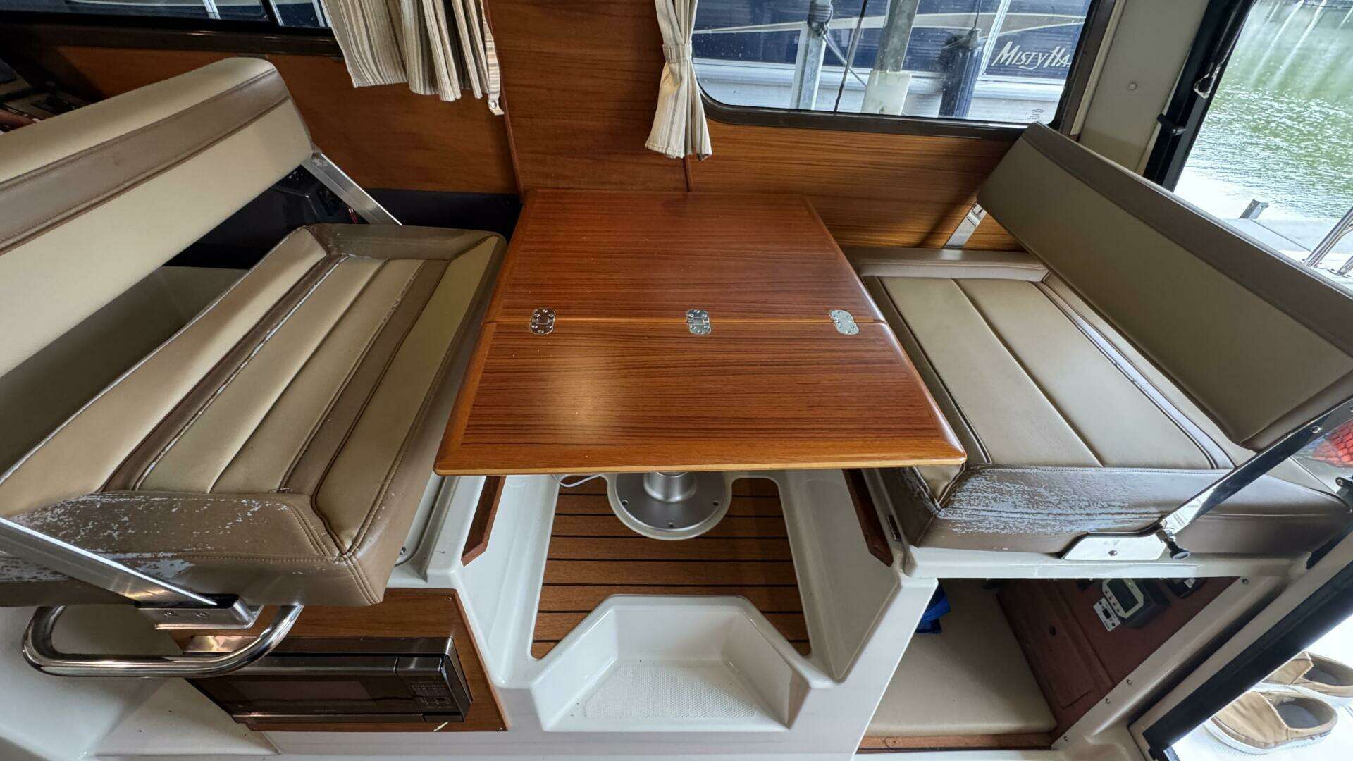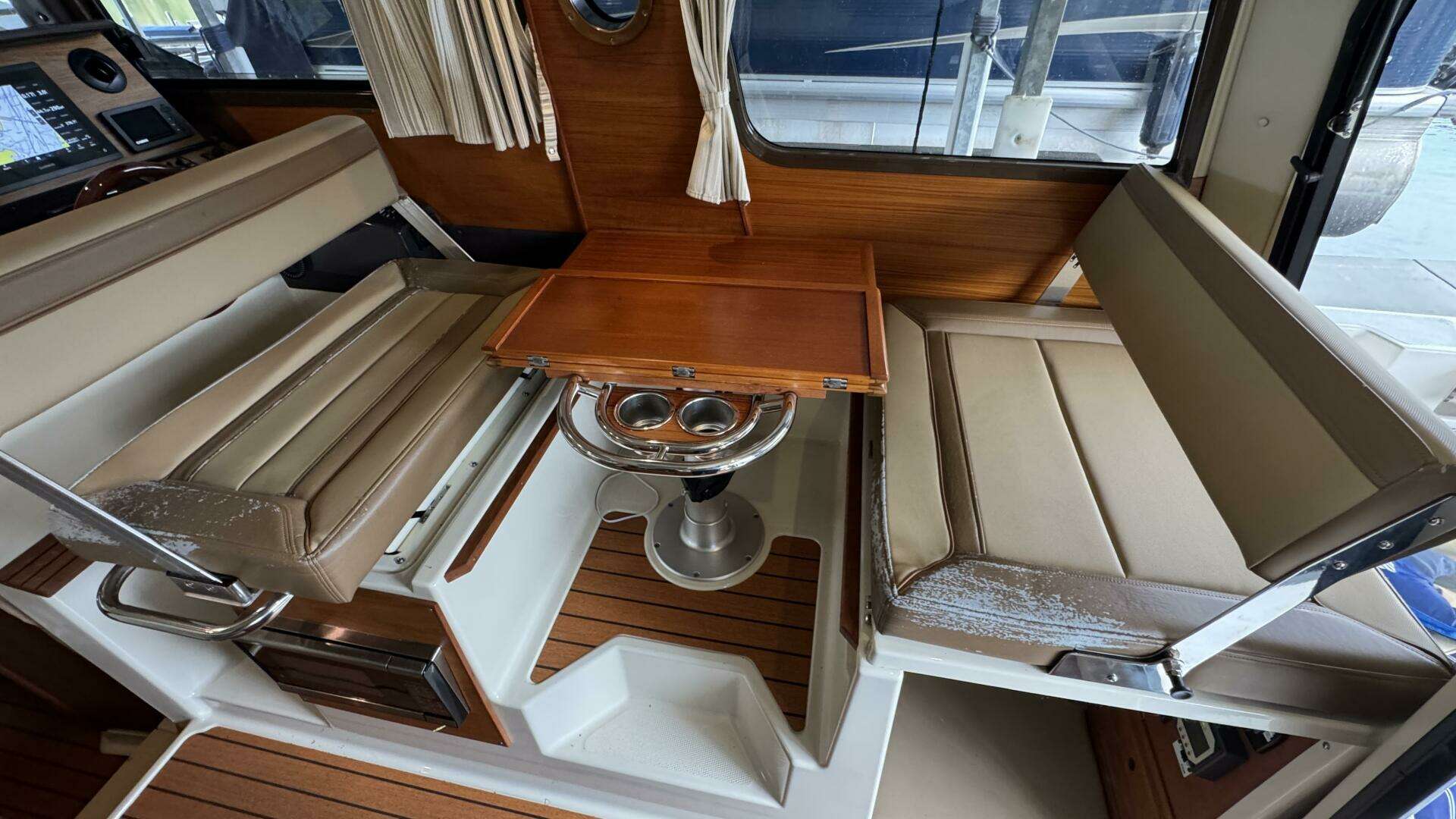 - Inside, the well-appointed cabin includes teak & holly sole, panoramic windows, and convertible seating.