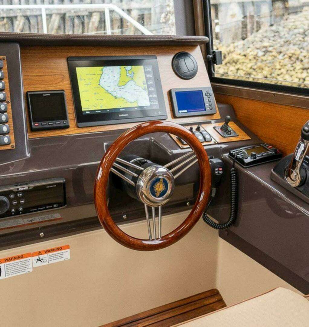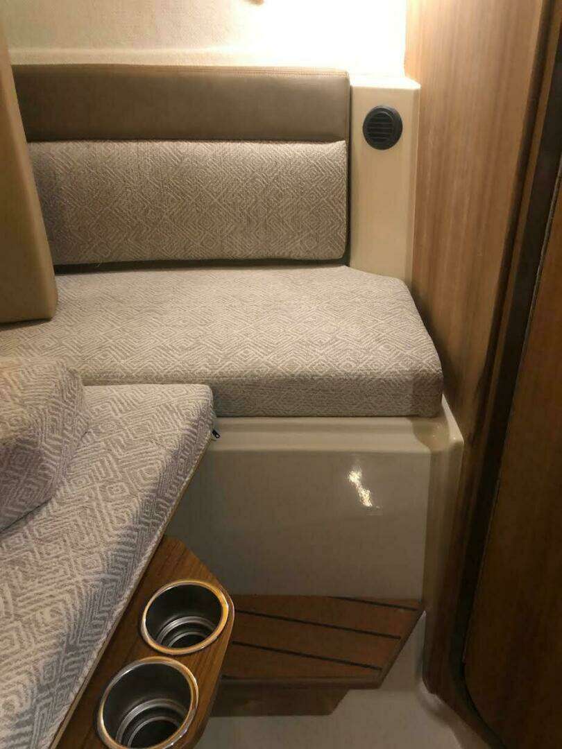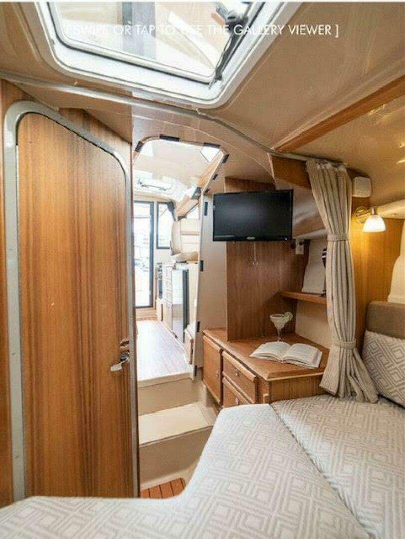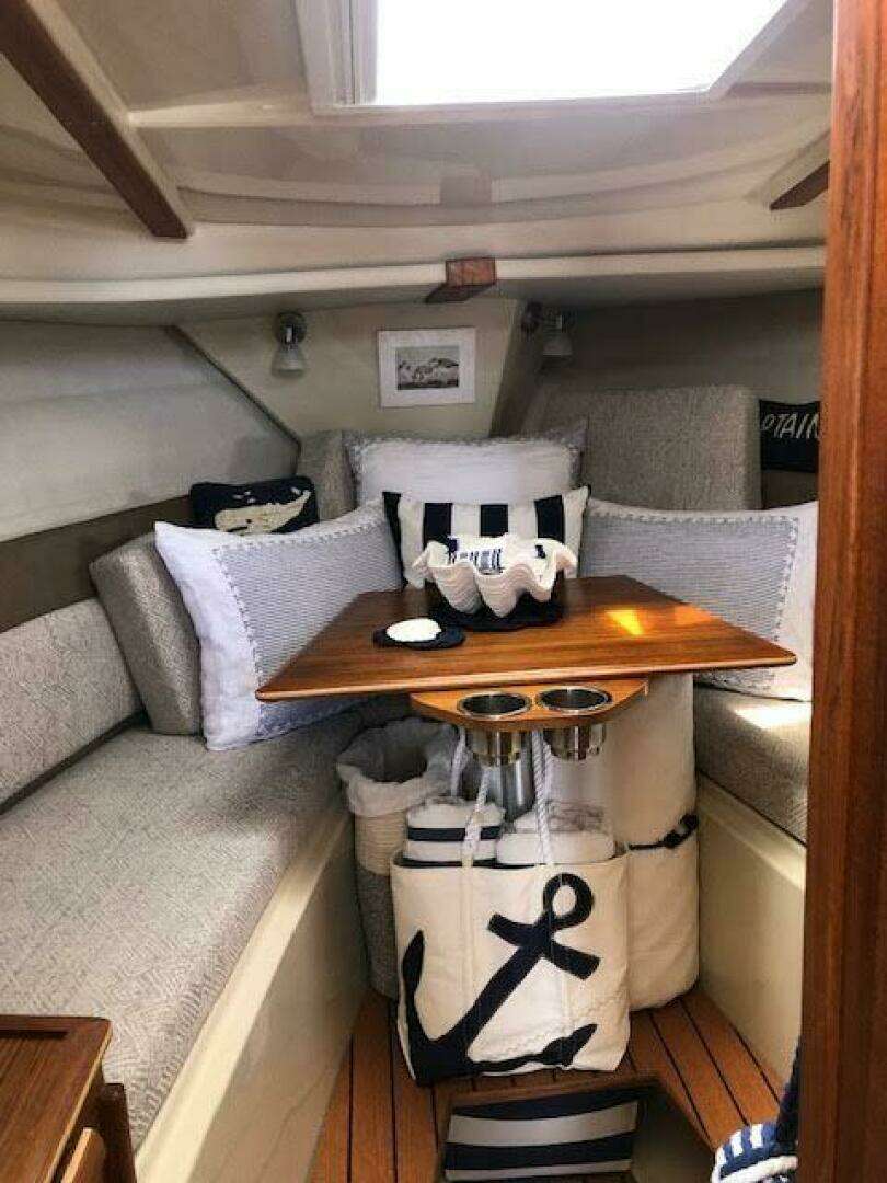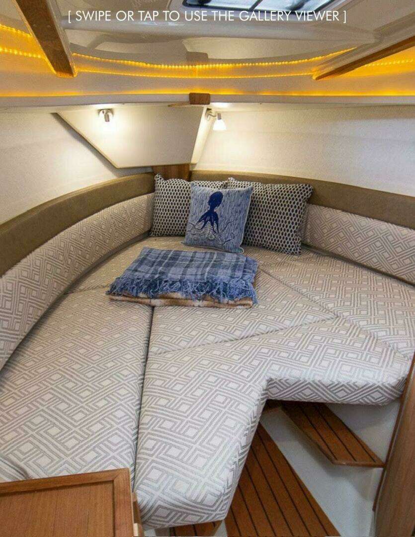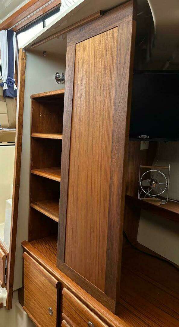 | Notable Upgrades: One of a kind custom designed and crafted Teak installations: • Forward berth bi-fold doors • Upper forward berth hatch folds open and neatly slides away in front of Helm • Sliding Closet door and interior shelving • Forward berth step • Additional, Extended forward berth bed board, to create more room for comfort and efficient use of sleeping space. • 2 way sliding screens and blinds installed on all 5 ceiling hatch covers. 4 in main cabin and 1 in forward berth • Modified port-side passenger seat position, increases usable galley counter space next to sink, without compromising seated legroom and tilting seat forward. • Added HVAC duct work to bathroom for those colder nights and mornings |