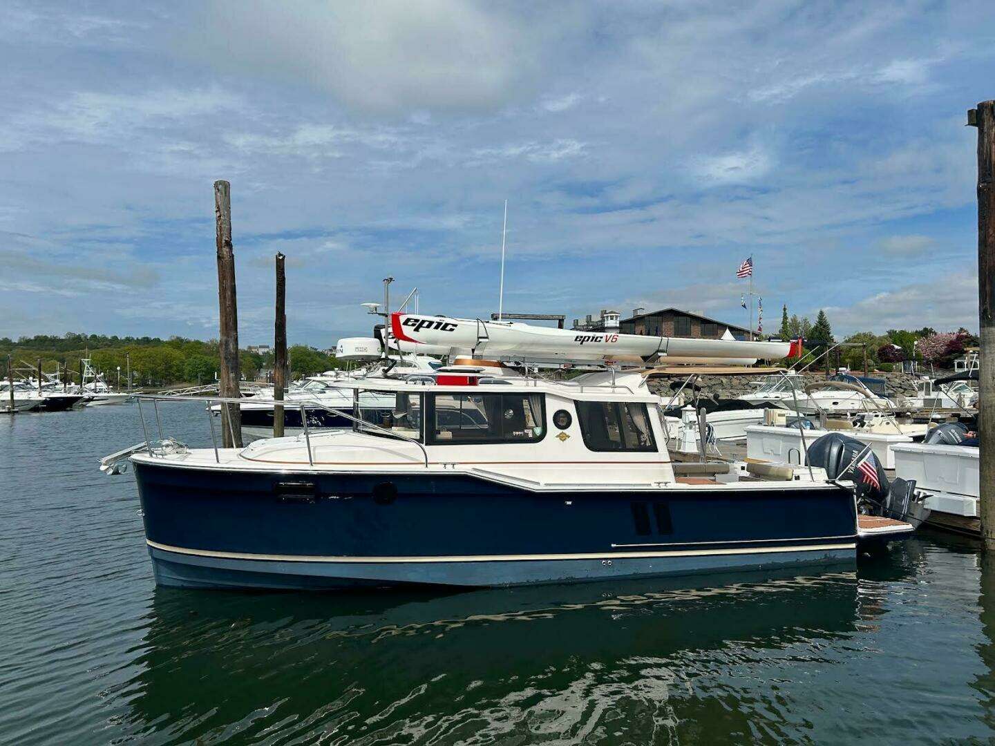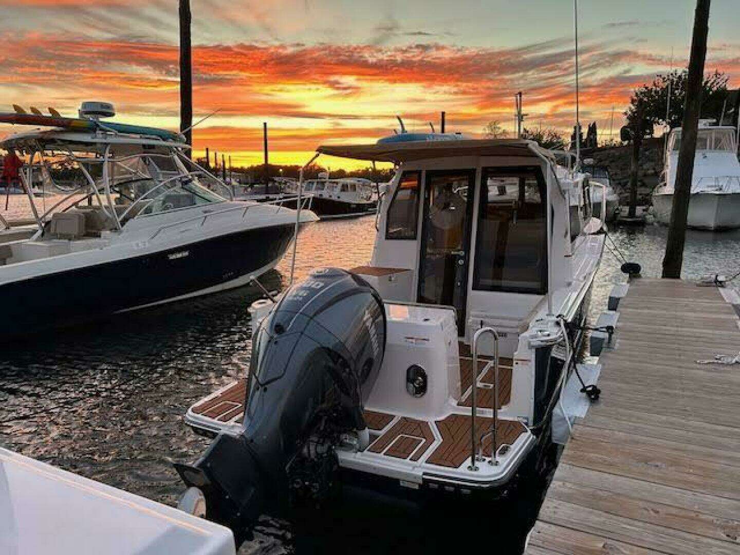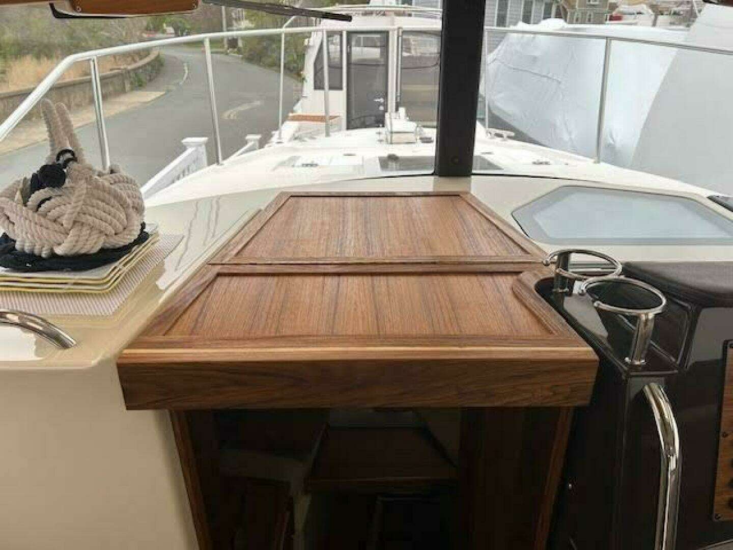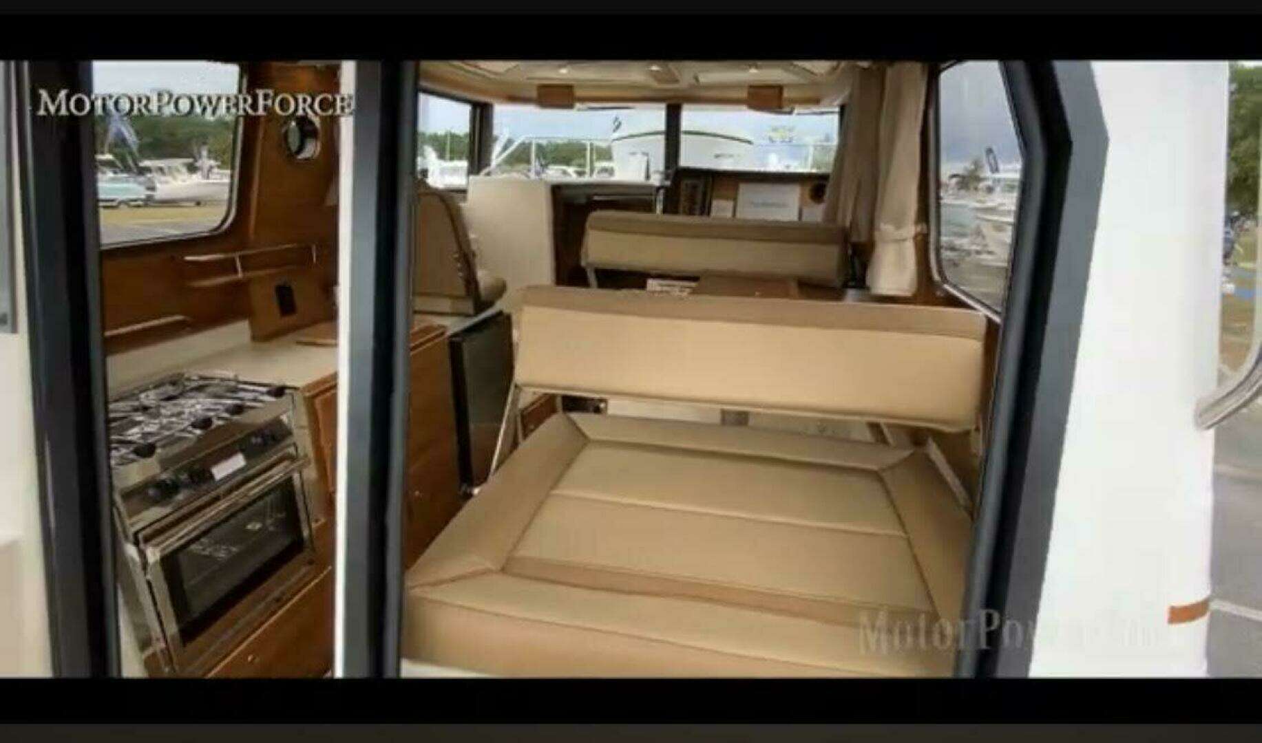 | Notable Upgrades: One of a kind custom designed and crafted Teak installations: • Forward berth bi-fold doors • Upper forward berth hatch folds open and neatly slides away in front of Helm • Sliding Closet door and interior shelving • Forward berth step • Additional, Extended forward berth bed board, to create more room for comfort and efficient use of sleeping space. • 2 way sliding screens and blinds installed on all 5 ceiling hatch covers. 4 in main cabin and 1 in forward berth • Modified port-side passenger seat position, increases usable galley counter space next to sink, without compromising seated legroom and tilting seat forward. • Added HVAC duct work to bathroom for those colder nights and mornings |