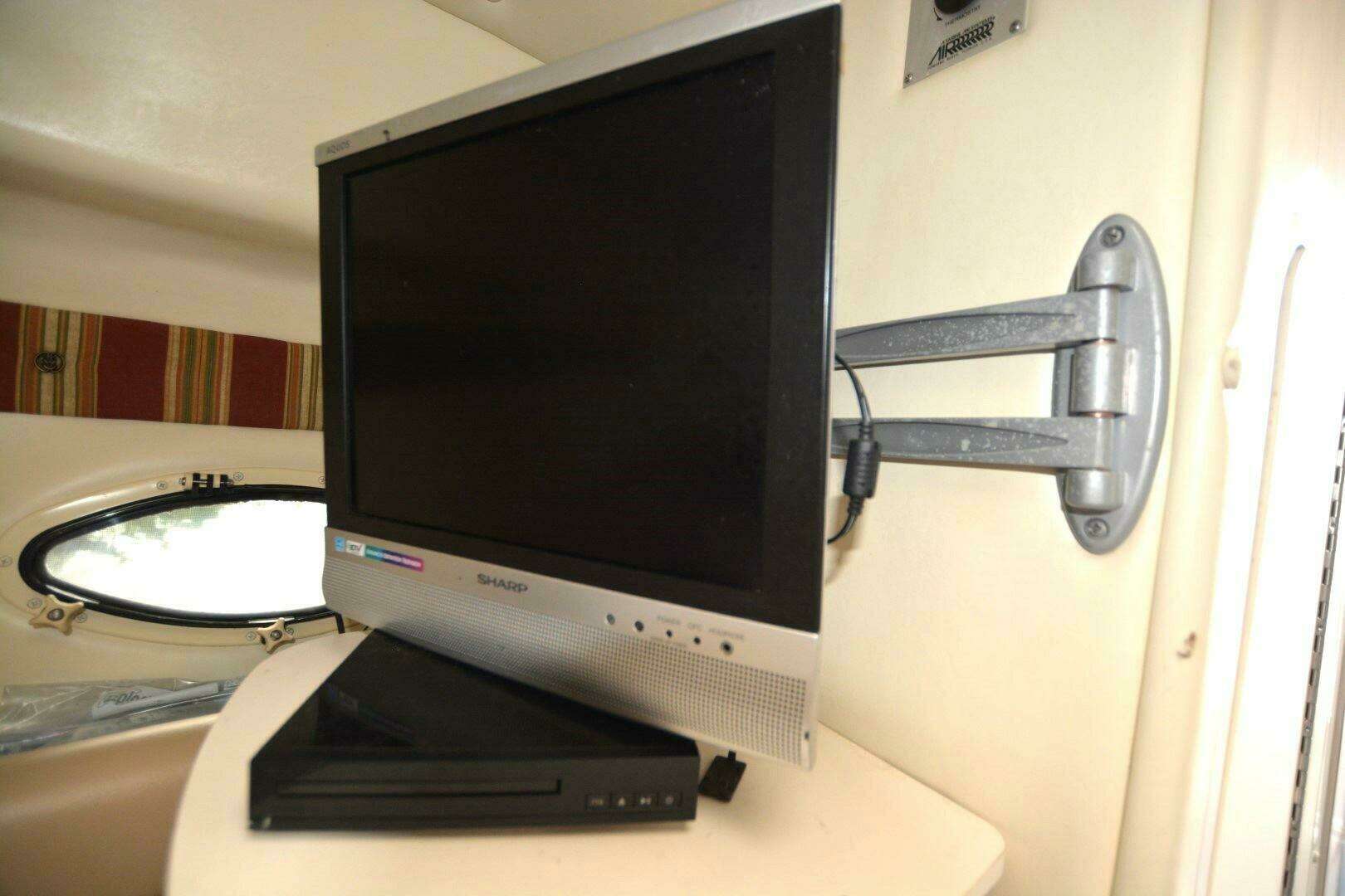 In her cabin she has a dinette forward which converts to a berth. Next aft she has her galley to port and enclosed head and shower to starboard. There is a mid-cabin berth under the cockpit. Up to the exterior where she had her anchor locker and windless forward. Nice sun deck area before the windshield. Her helm is to starboard with a 10' Garmin for navigation. She has a lounge to port and nice seat at her transom. The cockpit and sim platform has been upgraded with synthetic teak flooring.