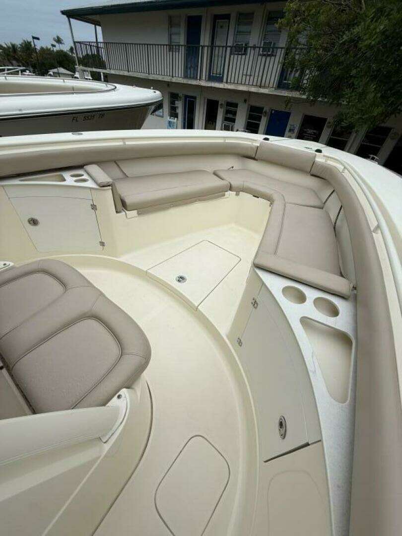 The cockpit is designed for anglers, featuring twin livewells and in-floor insulated fish boxes to keep your catch cold. An upgraded fiberglass leaning post includes stainless steel drawers, stainless steel sink, stainless rod holders, and integrated cup holders, providing both functionality and comfort while underway or at rest.