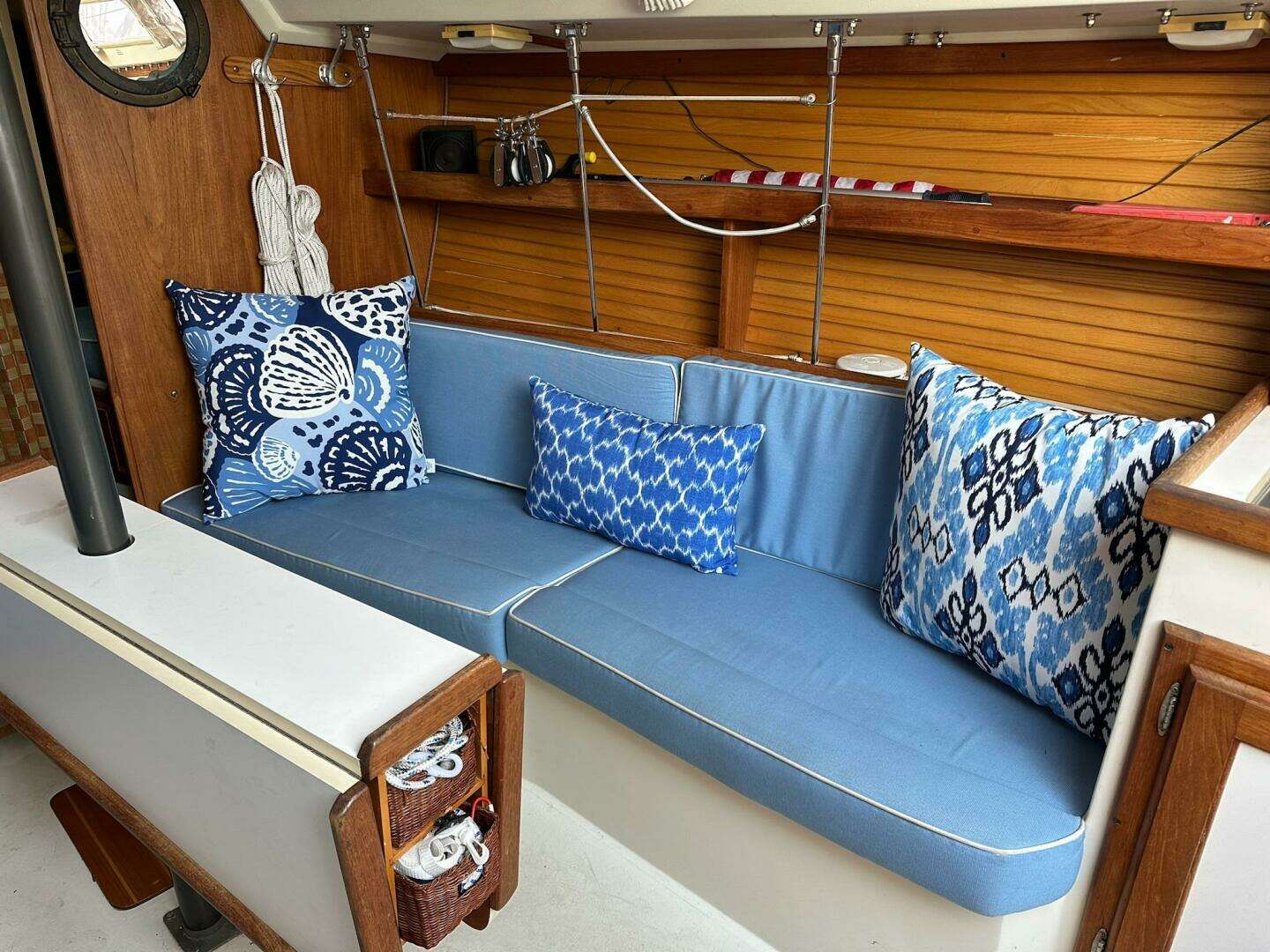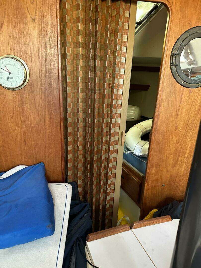Starboard galley with ice box, 2 burner stove (no propane tank). Portside enclosed head with manual toilet, shower, pressure hot & cold water system, holding tank. Centerline folding dining table, portside chart table. Forward vee berth.