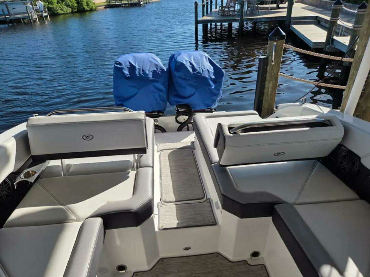 The R8 Outboard is intelligently designed with a higher profile and more freeboard for a deep and safe cockpit interior with a drier ride in big water conditions and is equipped with twin Yamaha 300hp engines to give you the ultimate in power, performance, and convenience for any boating excursion.