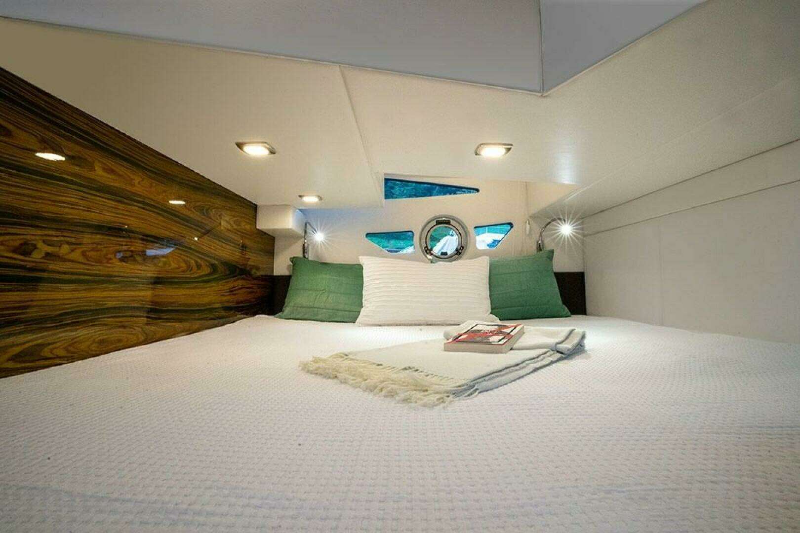 - Private Cabin with lounge seating, plus a bow berth that sleeps two, rare in boats this size.