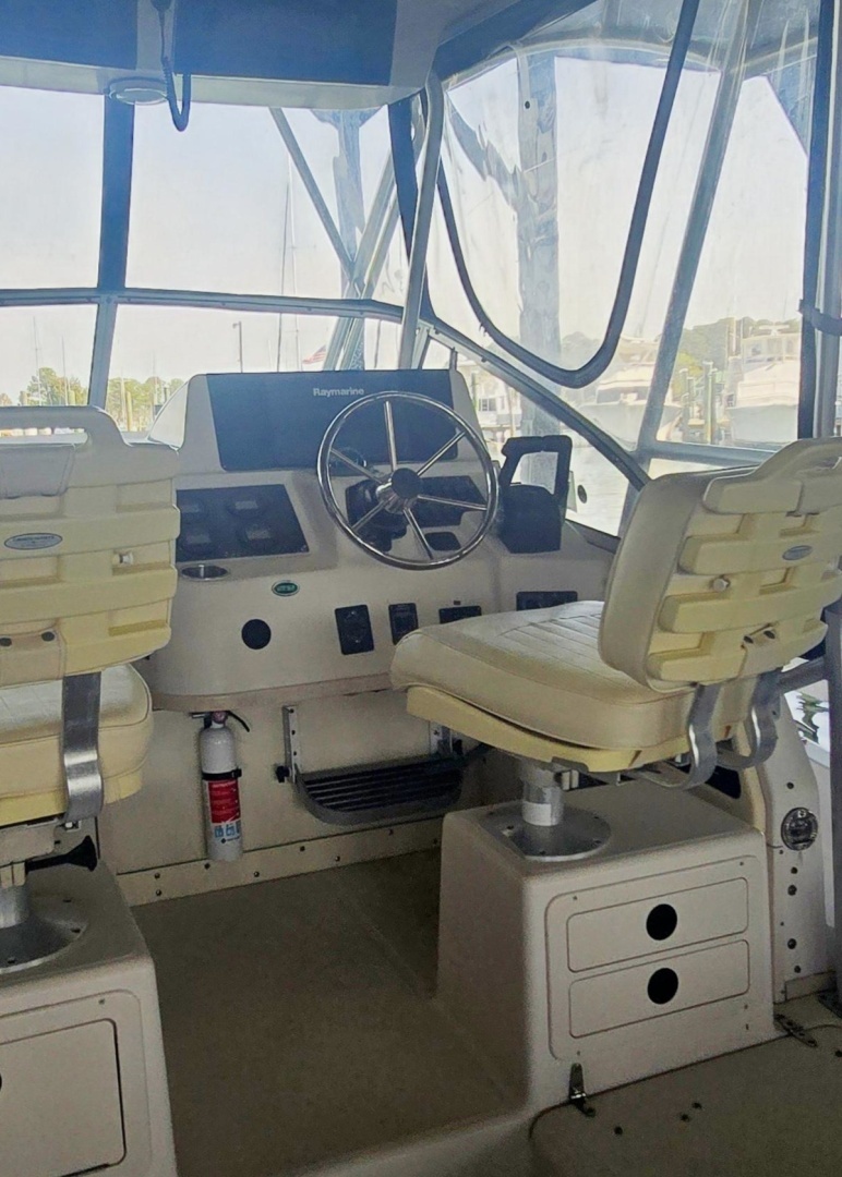 - Cockpit & Helm: The versatile large cockpit features a functional open layout for fishing—complete with a livewell, insulated fish boxes, and ample tackle storage. For social outings, the fold-up seating quickly transforms the space for entertaining. The helm offers excellent 360-degree visibility and intuitive access to all controls.