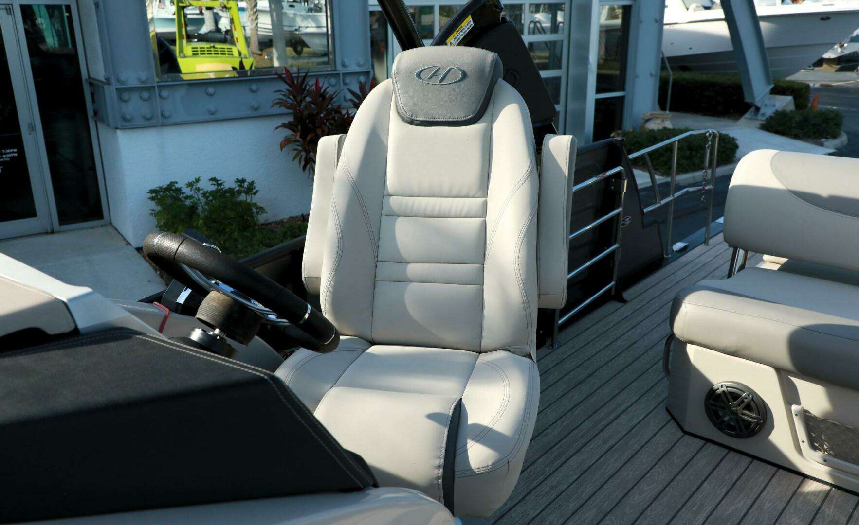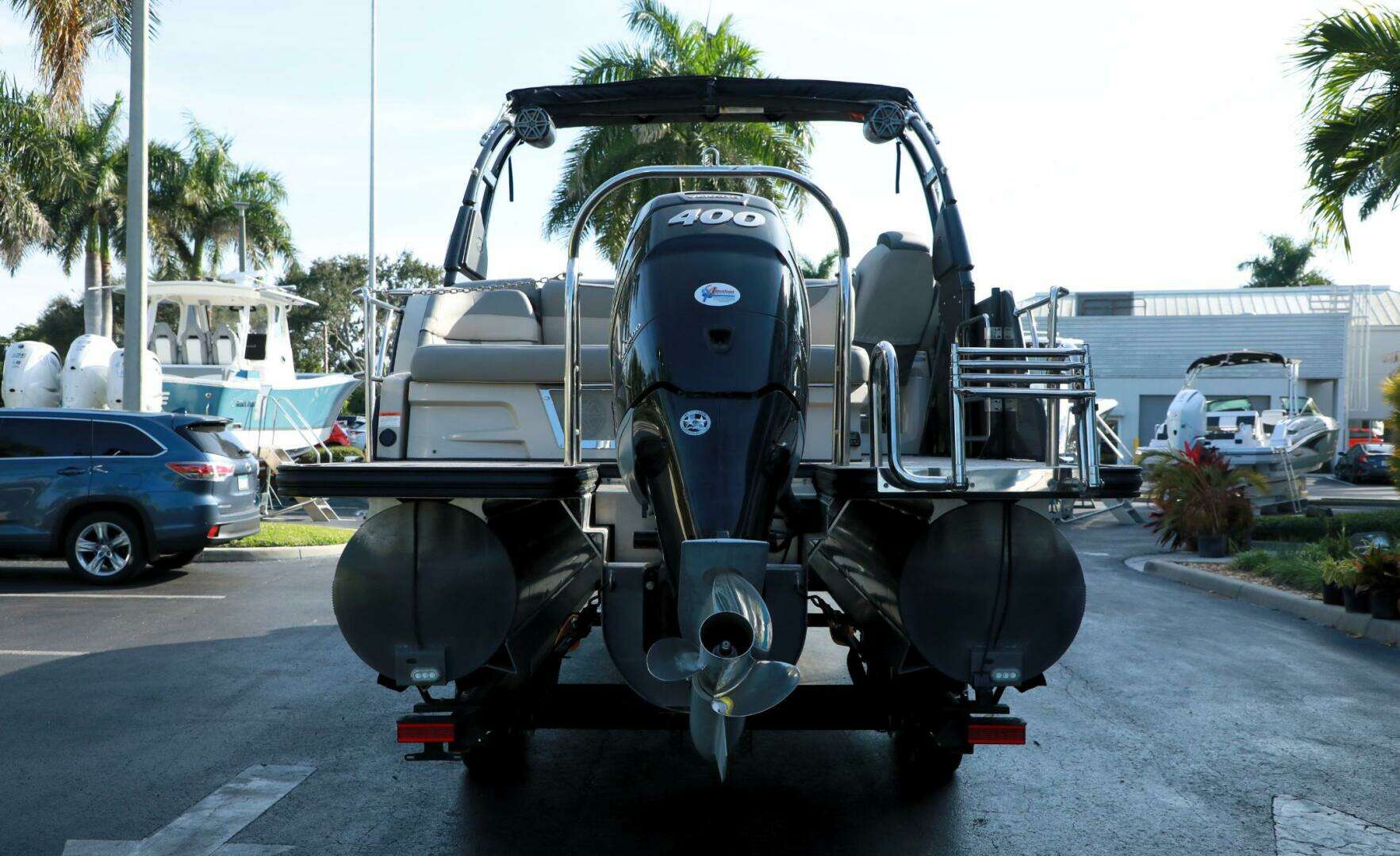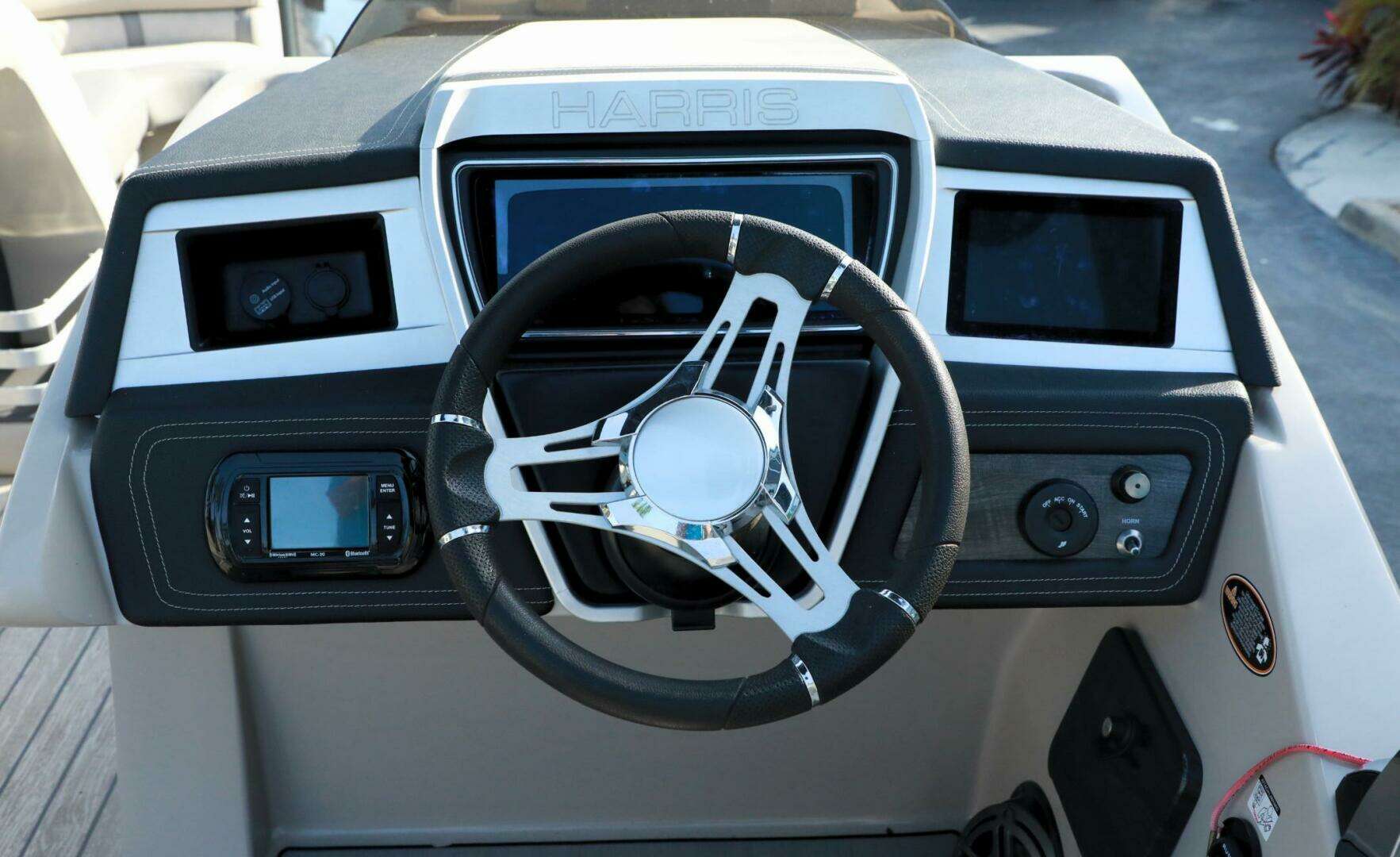 Pre-owned 2020 Harris Grand Mariner 250 pontoon boat with only 5 engine hours, Mercury 400HP L6, performance and tech packages, Ultra Tower, power steering and premium features, offered at $89,999 at Bonita Boat Center in SW Florida.