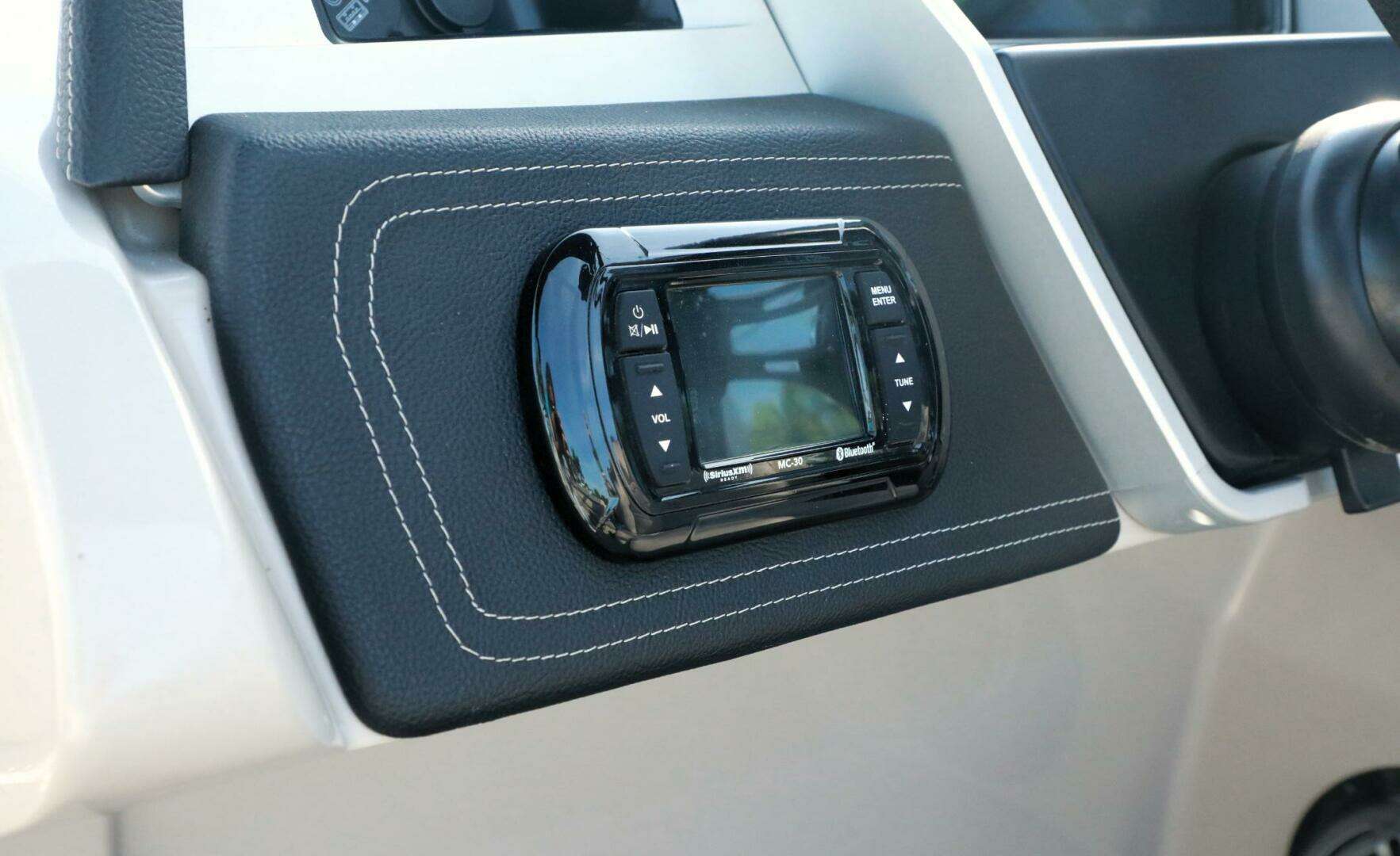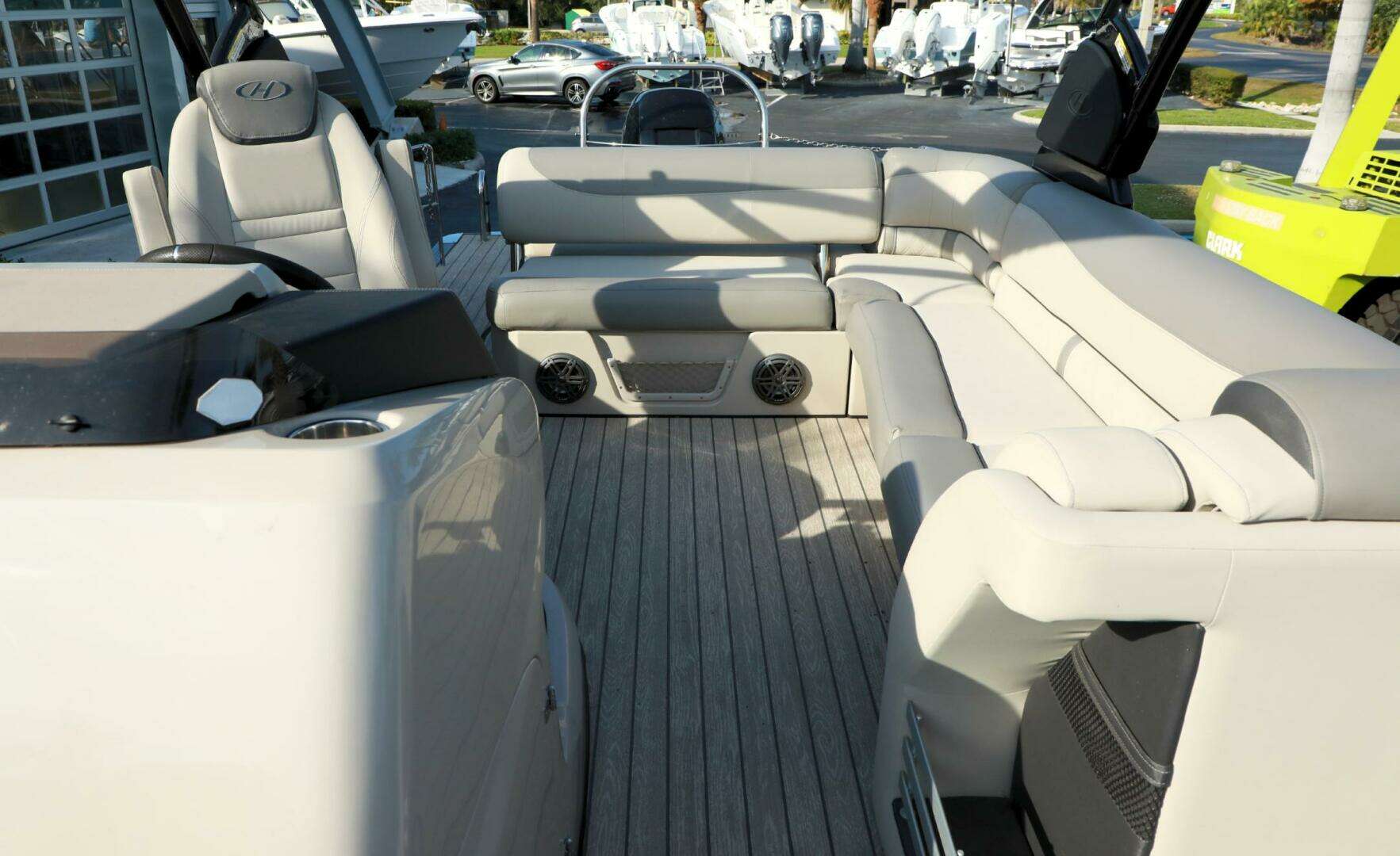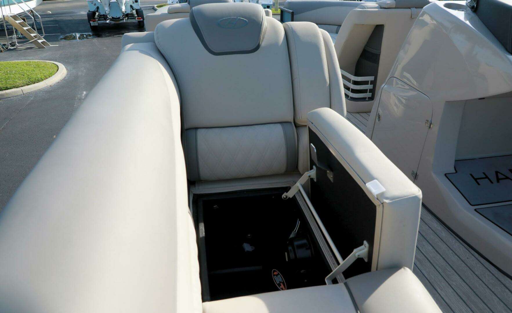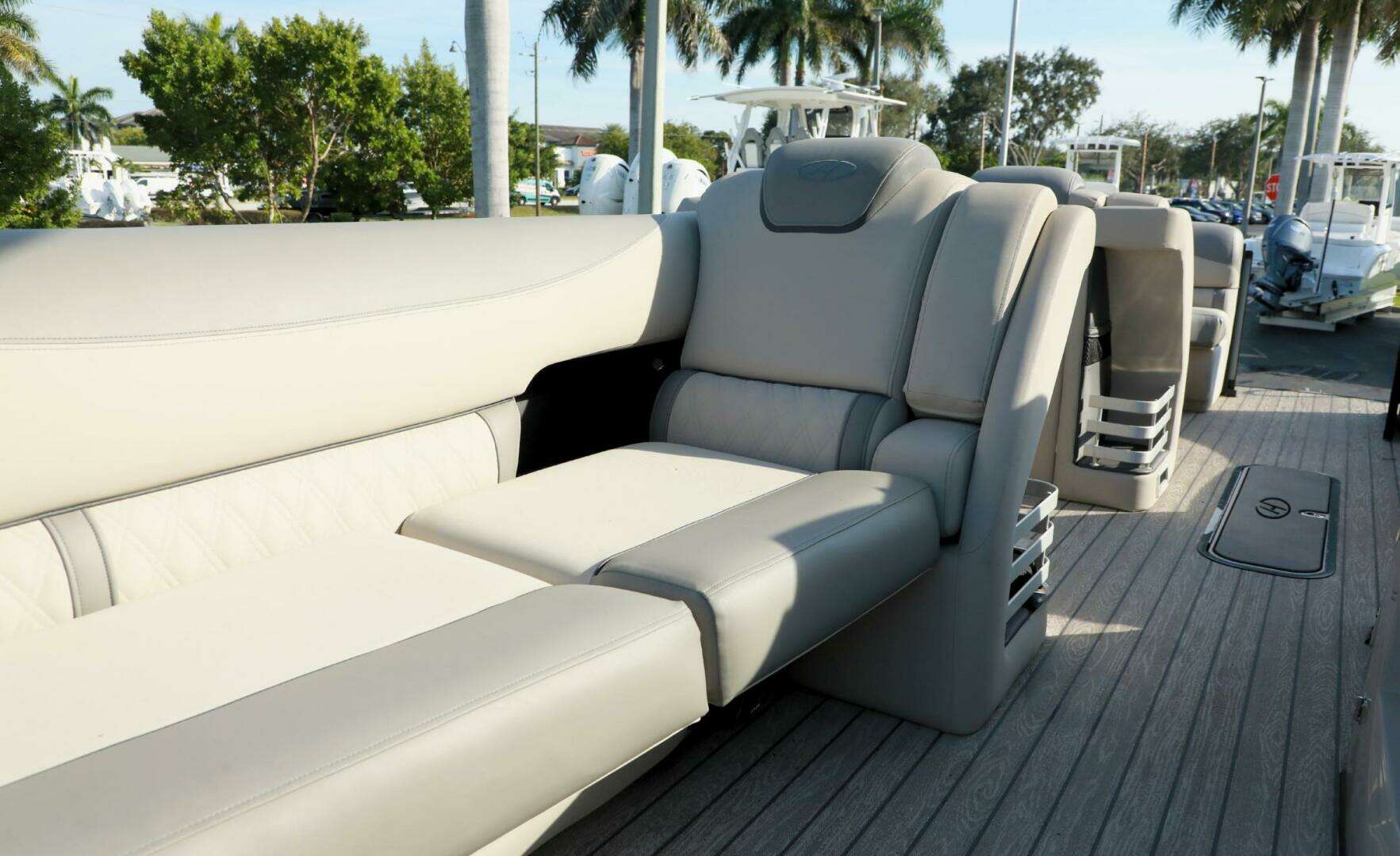 Pre-owned 2020 Harris Grand Mariner 250 pontoon boat with only 5 engine hours, Mercury 400HP L6, performance and tech packages, Ultra Tower, power steering and premium features, offered at $89,999 at Bonita Boat Center in SW Florida.