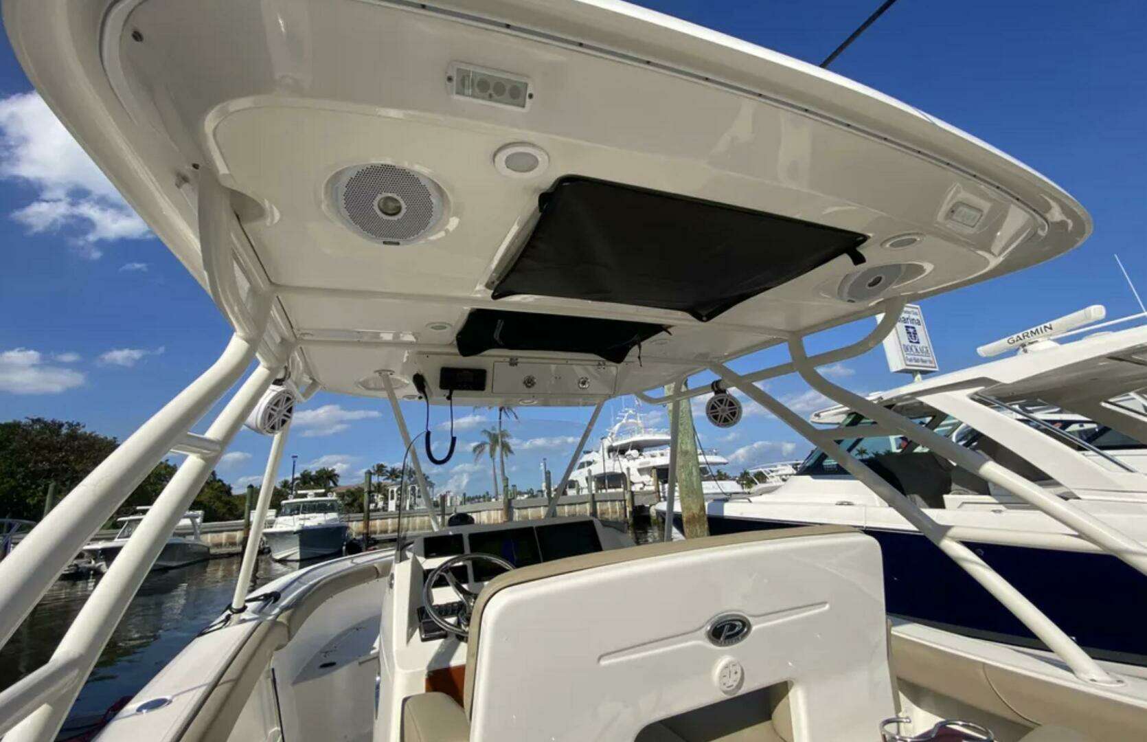 - Polk stereo with bluetooth streaming, 4 speakers and remote control pad at helm. Console mounted iPod MP3 player interface jack
