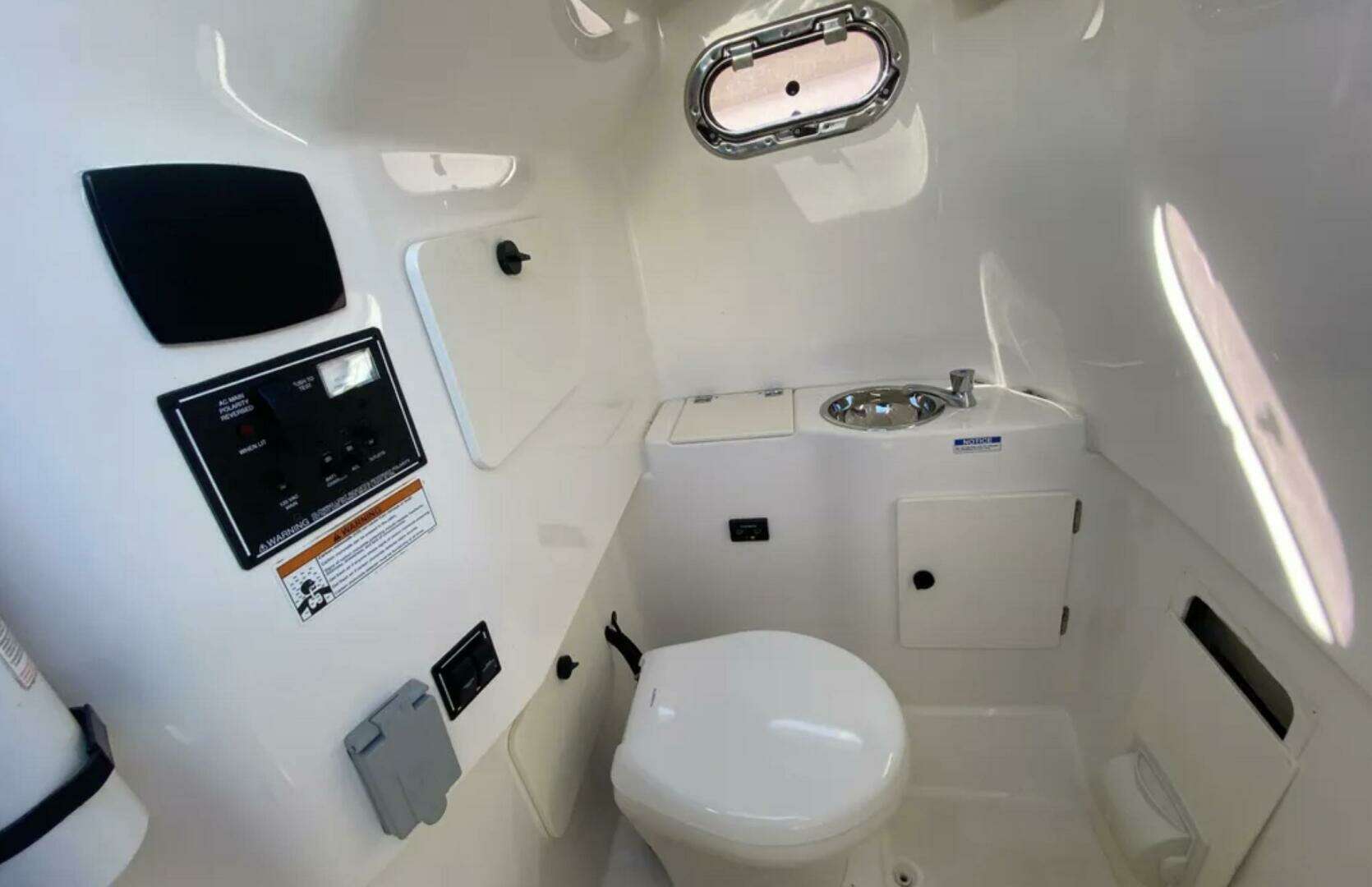 - Enclosed compartment with electric head, 20 gal. holding tank, macerator and pressure stainless steel water sink