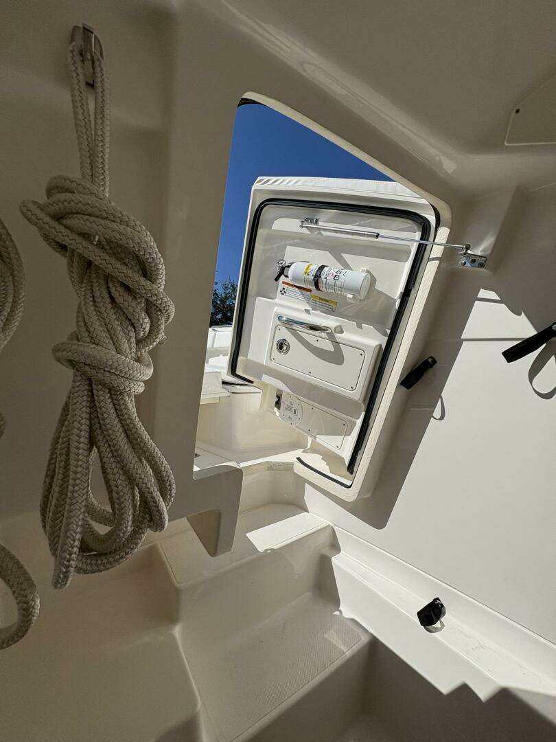 - Flush Mounted Integral Anchor Locker with Fiberglass Lid including: Horizontal Anchor Windlass with Switch at Helm, Remote at Anchor Locker and Raw Water Washdown