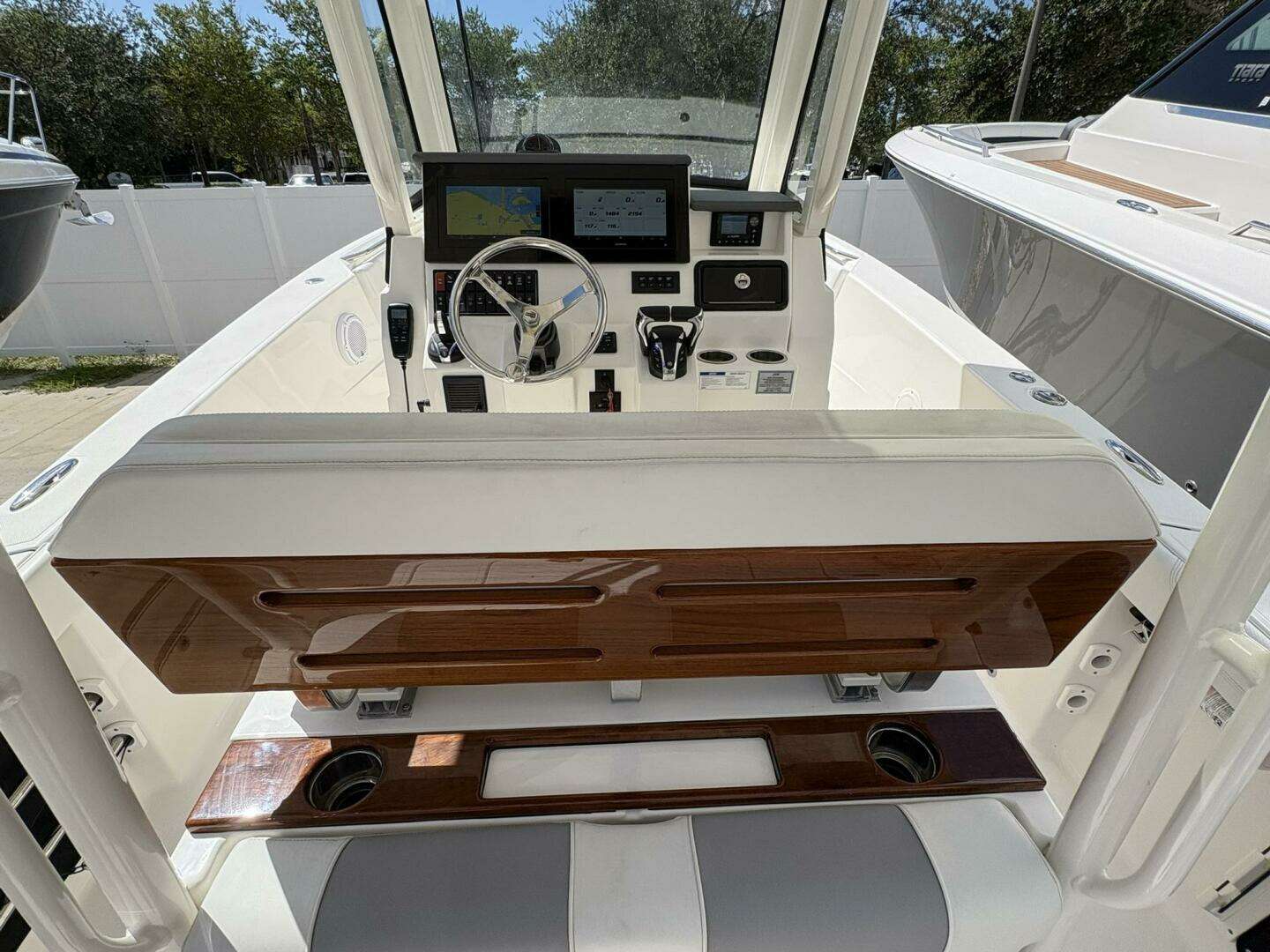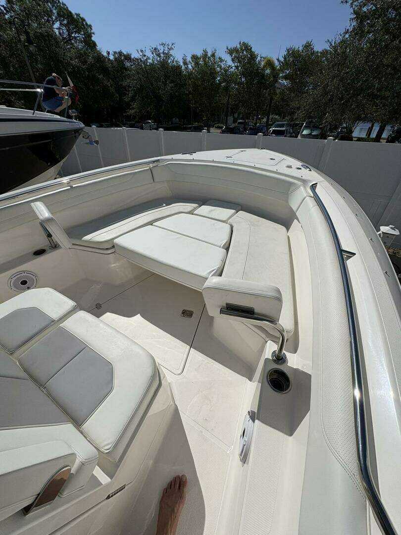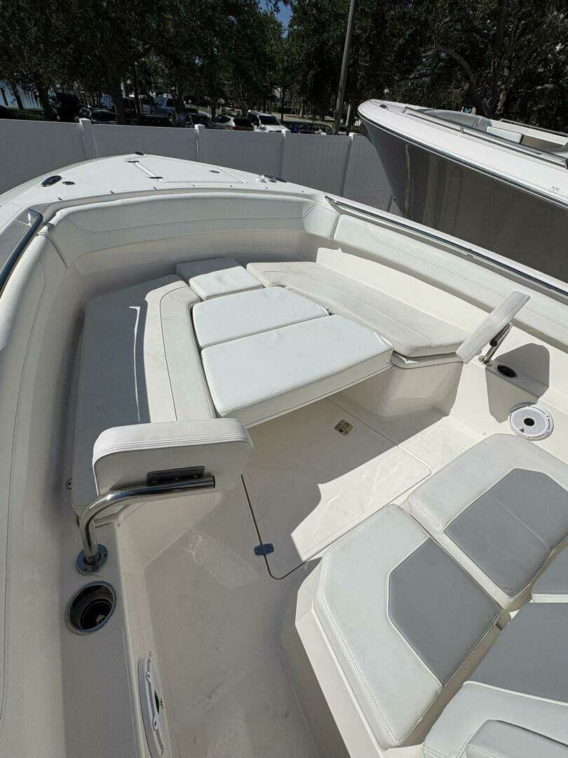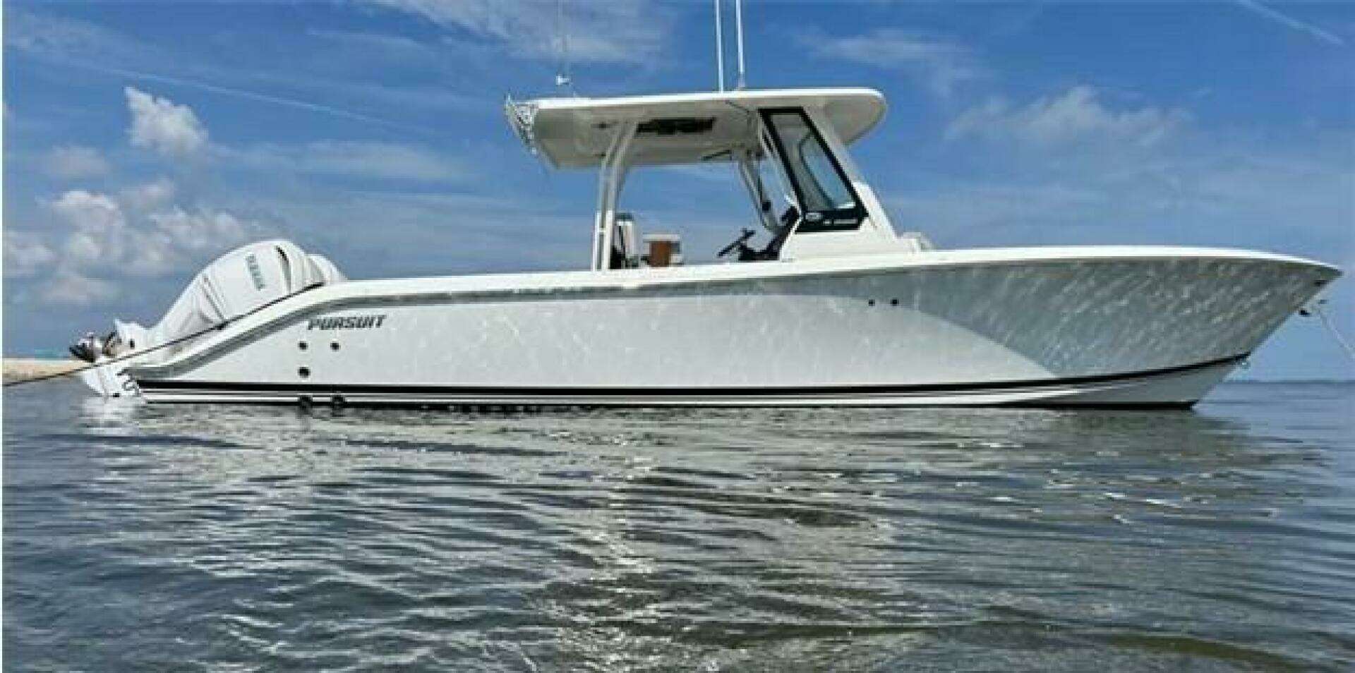 Hot Pursuit is a 2023 Pursuit S 288 Center Console that has been indoor stored since new by her experienced owners. She is powered by twin Yamaha F300 Outboards with the Helm Master Joystick Option (set point and autopilot), and extended 5 year warranties and includes all of the must have factory options including, Dual Garmin Displays, Under Water Lighting, mid-level cockpit accent lights, Premium Stereo amp upgrade, Bow filler cushions, upgraded white/gray upholstery, Bow/Cockpit fiberglass table, Bow Tow Eye, Side door with boarding ladder, Hard Top Mounted Rod Holders (6), Bow Mediterranean Style Sunshade, Canvas covers for Bow, Helm Seat and Dash.