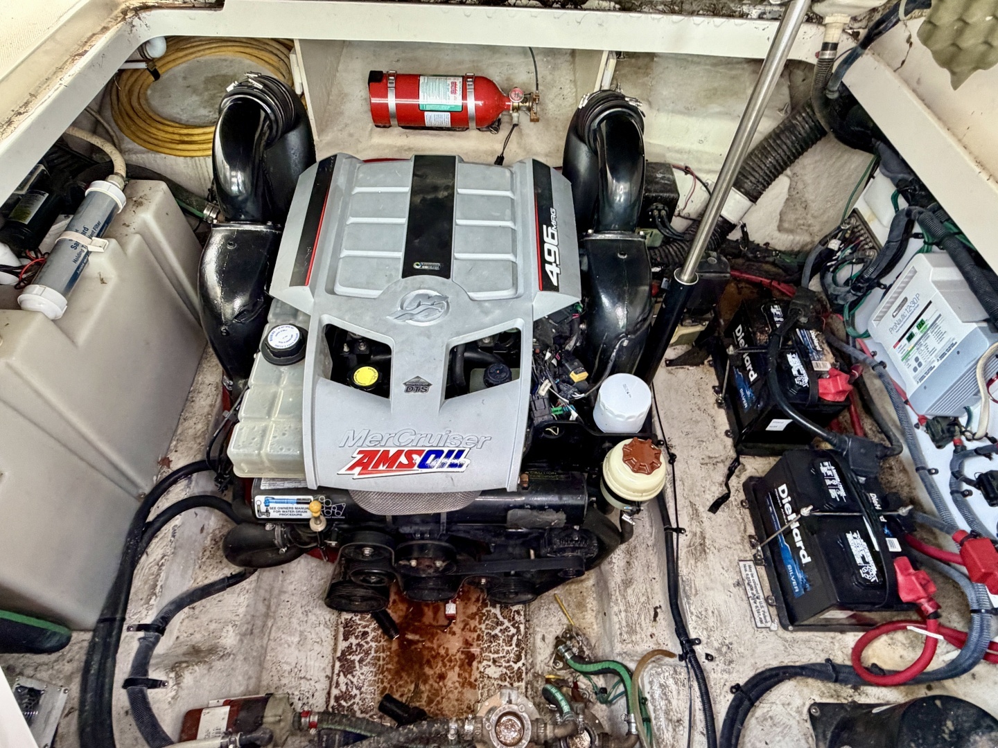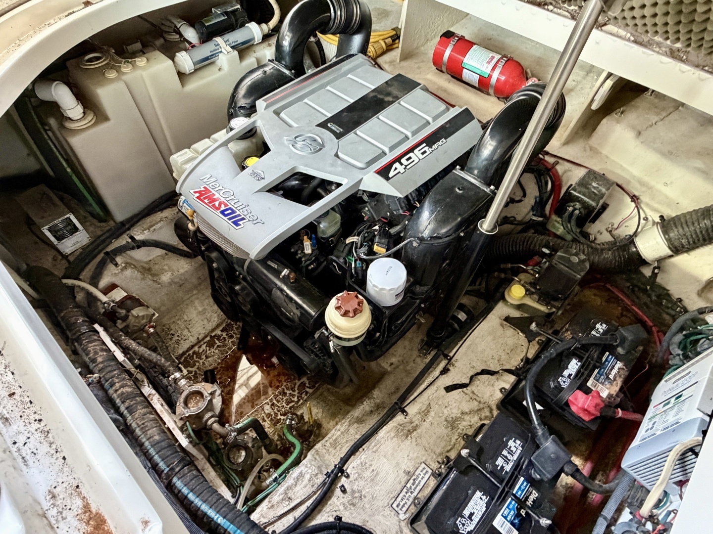 Stepping into the cockpit from the starboard side corner you'll find a removable solid teak cockpit table if it's deployed or stowed under the port side cockpit seat if it's not. A cockpit wet bar is to the starboard side at the base of the radar arch and an inoperable electric grill/griddle is integrated with storage below. The engine hatch is powered and with it raised you'll find the 496Magnum MerCruiser centered in the engine room, the waste holding tank will be along the starboard side wall, the fresh water tank sits towards the bow, and a marine safe heater is mounted between the tanks, the 5kW Kohler generator is mounted just in front of the engine. To port you'll find the 6-gallon dual-source water heater, onboard 30AMP battery charger, a pair of group 27 marine batteries, and just behind the engine is the sea-fire fire suppression extinguisher.