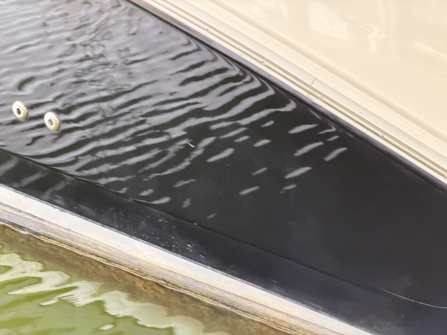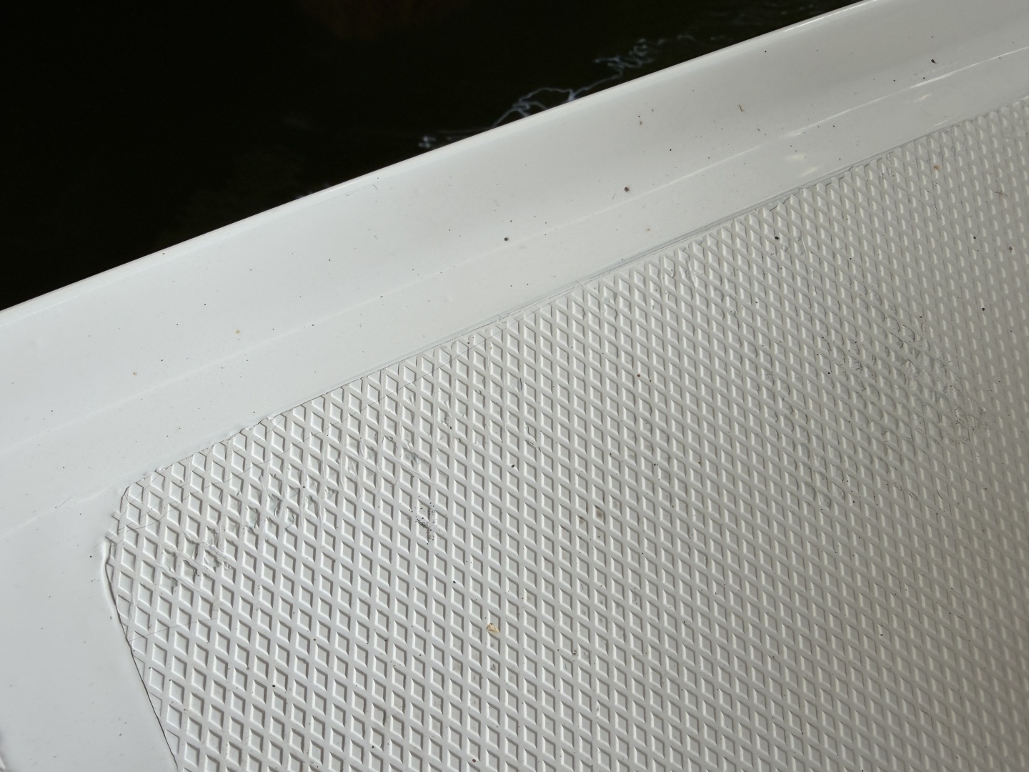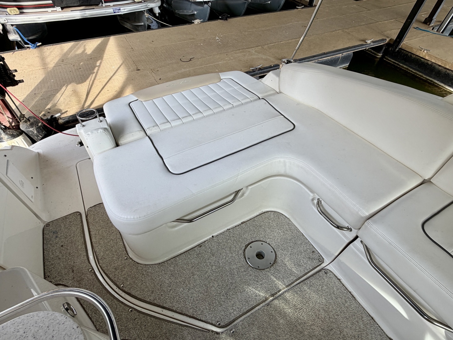 Boarding at the integrated swim platform you'll notice 30Amp shore power and dockside water connections to the portside, a 3-step swim boarding ladder just under the platform also at the port side, an integrated storage trunk at the backside of the fold-down transom seat which lays flat to make a sun lounge, a ski-tow hook at the transom and a hot/cold handheld shower at the starboard corner.