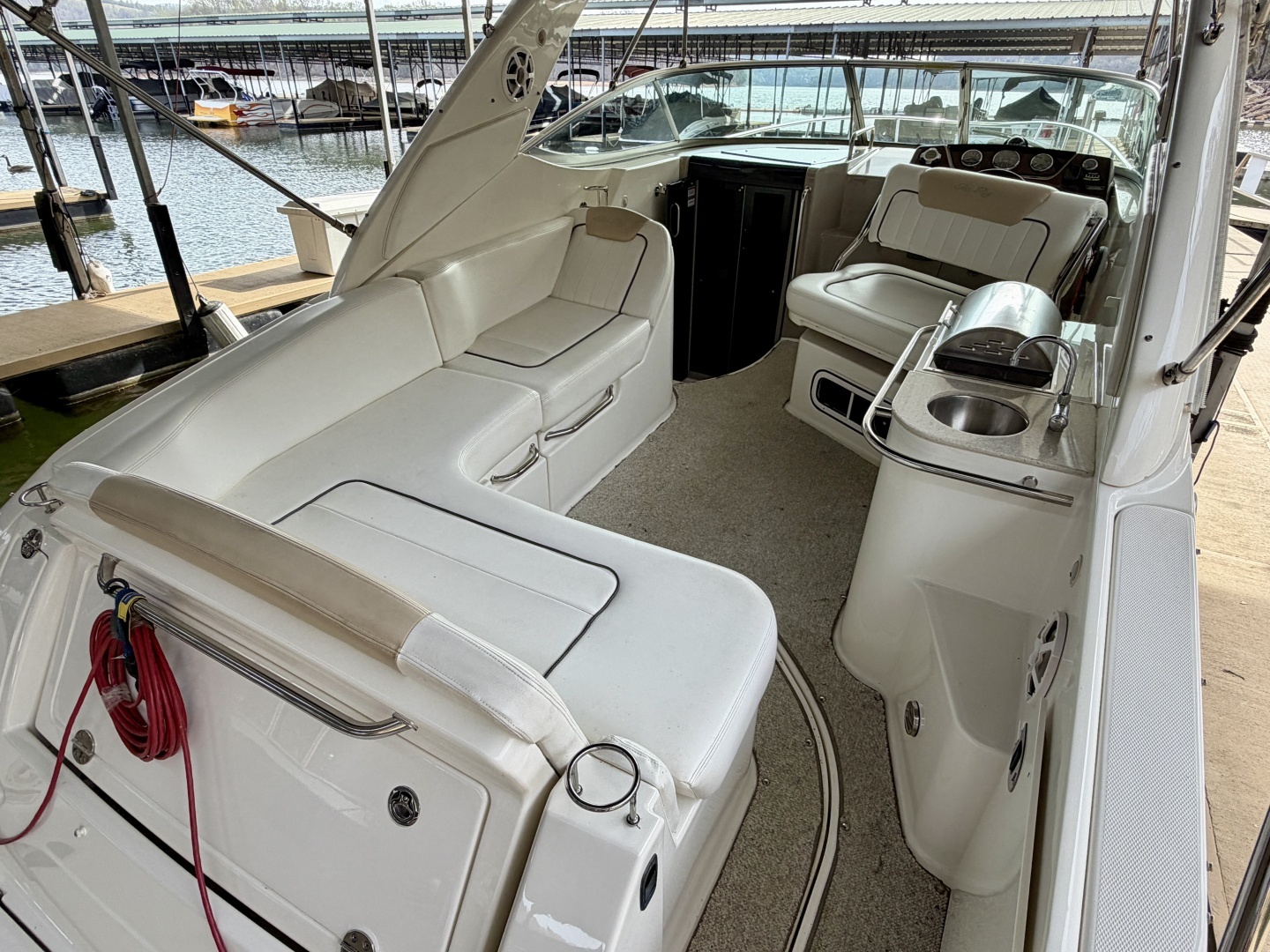 This Fresh Water 2009 Sea Ray 270 Sundancer Express Cruiser For Sale on Norris Lake Tennessee is equipped with a 496MAG MerCruiser SeaCore DTS V8 Inboard/Outboard engine with Bravo III dual prop outdrive and features a 5kW Kohler generator, a marine air conditioning unit with reverse-cycle heat, a windlass anchor, a convertible v-berth dinette and mid cabin sleeping berth (sleeps 4), a vaccuflush head with shower, a cabin AC/DC fridge, alcohol/electric range, integrated sink and microwave, cockpit wet bar, convertible aft sun-lounge seat, dual bimini tops with camper canvas/isinglass enclosure (not shown), sony stereo with dual aux inputs, driver and cabin remotes, a JL audio amplifier, cockpit and cabin speakers plus a cockpit subwoofer, raymarine C-70 GPS/Chartplotter, hydraulic trim tabs with indicator gauge, VHF radio, compass, plus a smart-craft gauge with integrated fuel flow meter, engine data, troll control, depth finder & water temperature gauge - other notable equipment includes a remote spotlight, powered engine hatch, onboard battery charger, sea-fire fire suppression system, hot/cold transom shower, under water lighting, cabin screen door, cockpit and cabin heaters, and more!