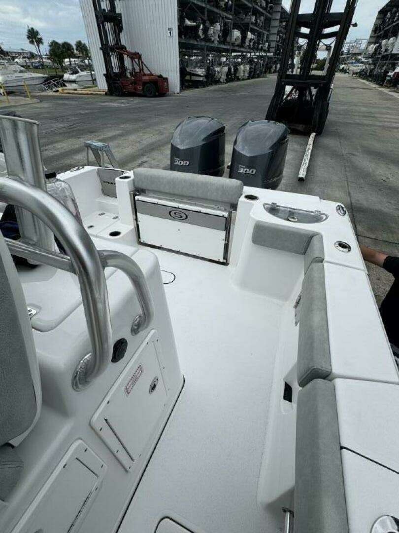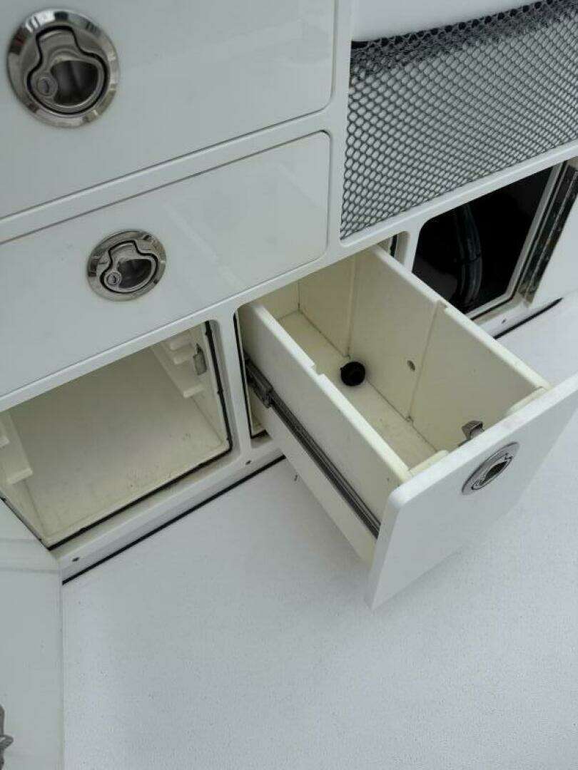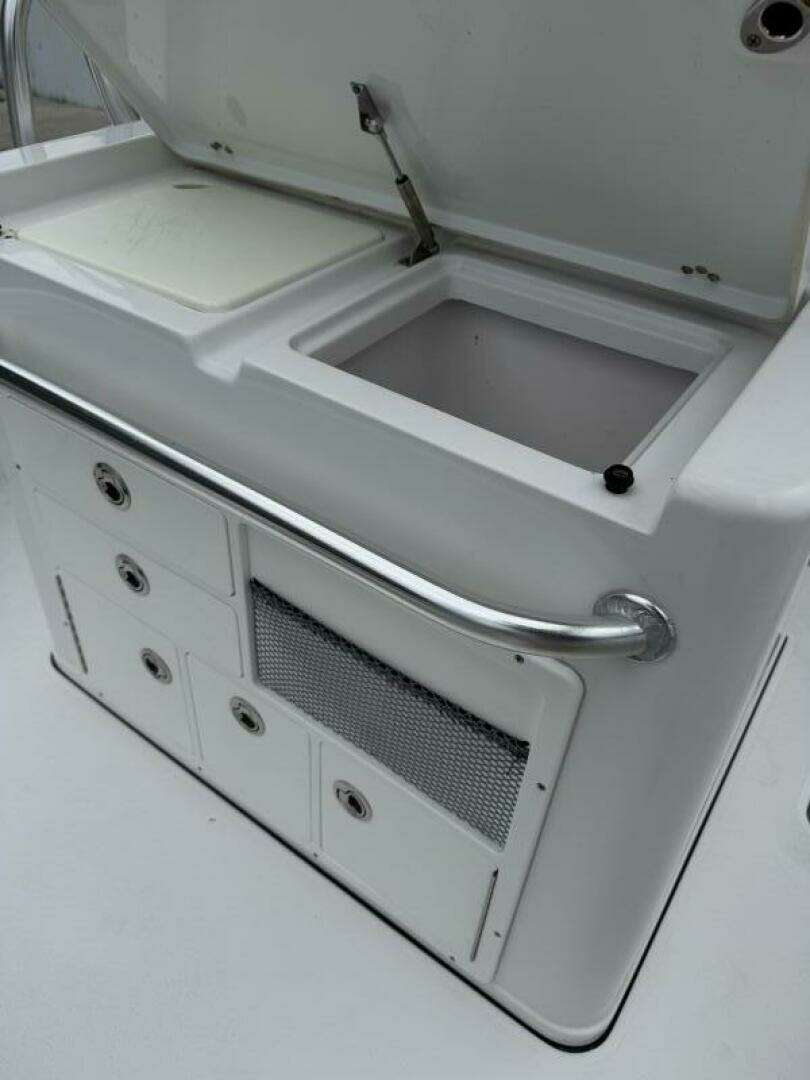- Fishing Equipment: Includes a transom livewell (30-gallon), two large insulated in-deck fish boxes, nine rocket launcher rod holders, and ample vertical and horizontal rod storage.