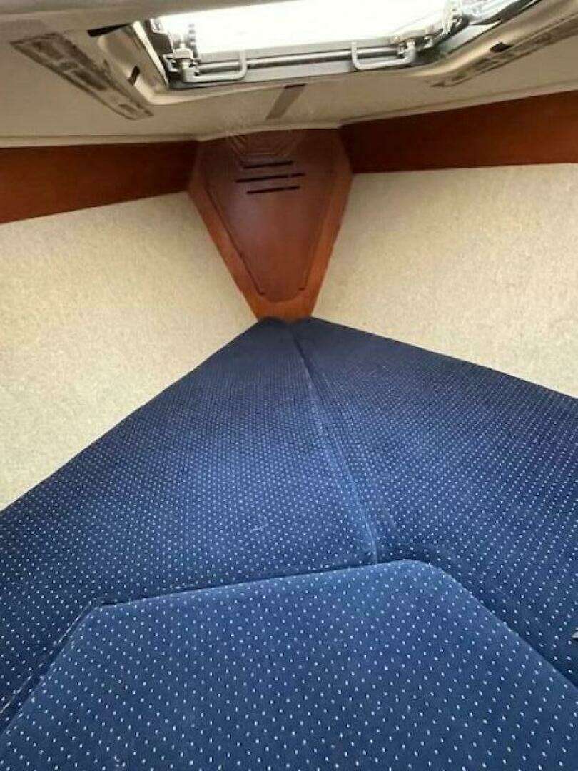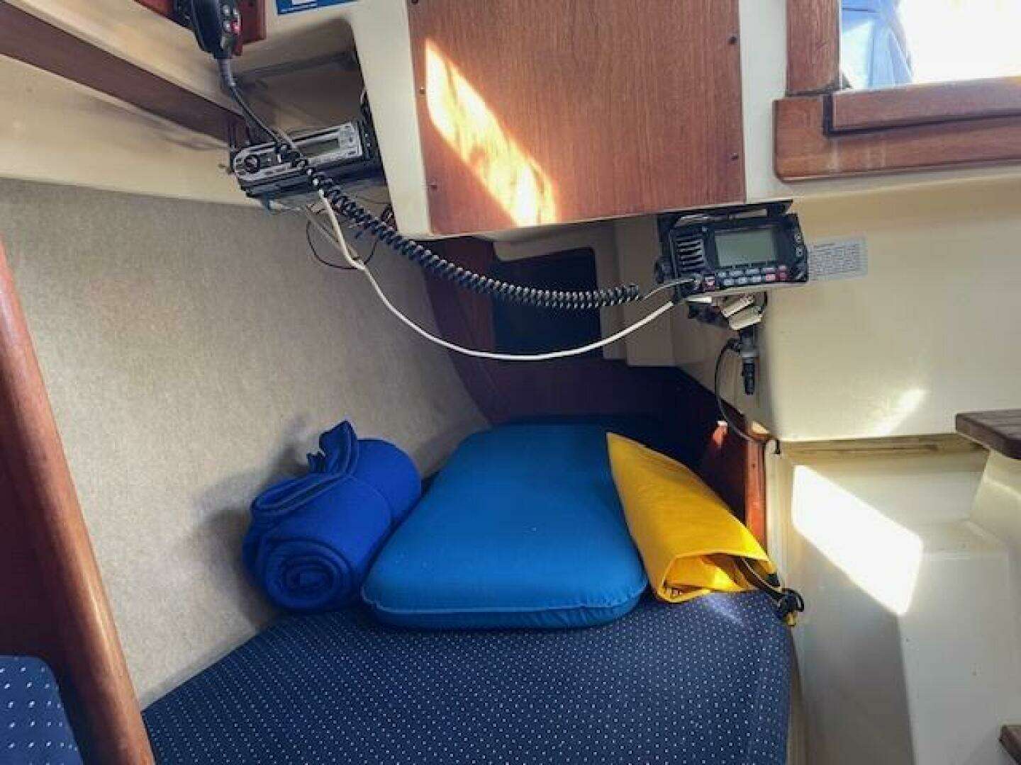Contoured 5" foam cushions with updated fabric covers. Seat portside in fore-cabin makes into double. Starboard settee with padded lee board/seatback coverts to form double. Wide quarter berth with ample storage below.
