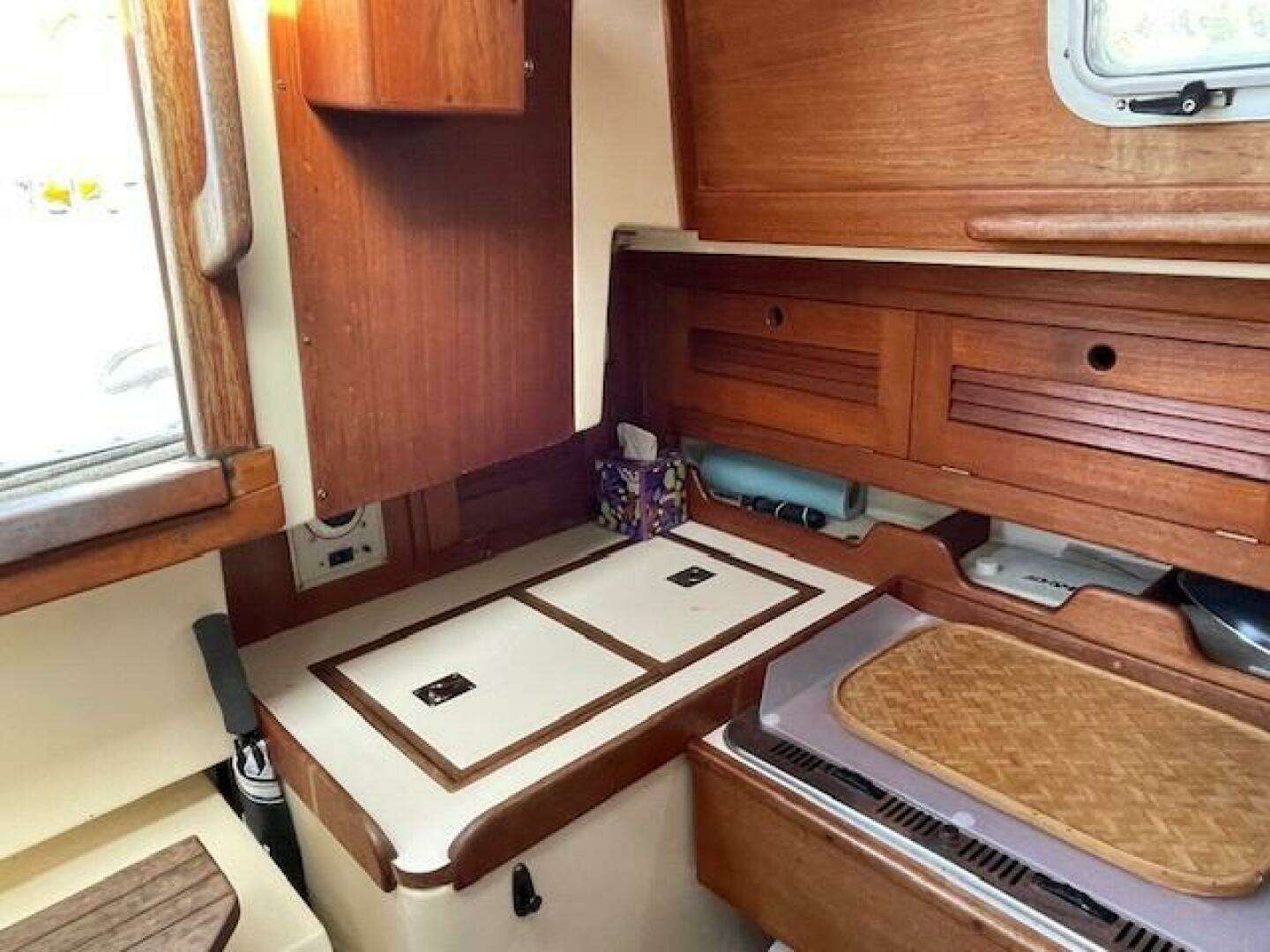 U-shaped with icebox aft and stainless steel sink flanking 2-burner gimballed alcohol stove. Pressurized water with faucet and foot activated pump to a telescopic faucet at galley sink. Drop-leaf, bulkhead mounted teak table.