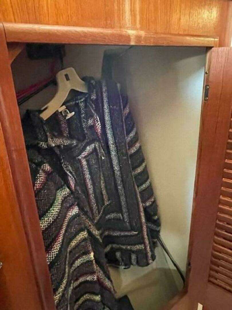 Hanging locker opposite head. Shelves with teak louvered doors outboard of bunks and galley. Locker and shelve storage in head. Appropriate bin storage below counters and berth throughout.