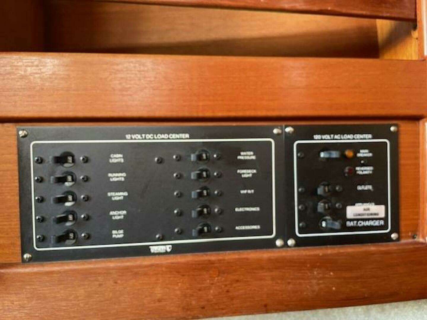 55 amp alternator, 100 amp hour dual batteries. 120 volt AC shore power with cabin outlets. 14 gauge stranded copper wiring minimum, soldered terminals, protected against chafe, run in conduit where appropriate. Master switch, 6 place circuit breaker panel. Interior lights, navigation lights, including steaming and mast head light. 17 gallon aluminum fuel tank, 30 gallon polyethylene water tank, 14 gallon holding tank with deck pump-out. Fresh water pumps for head and