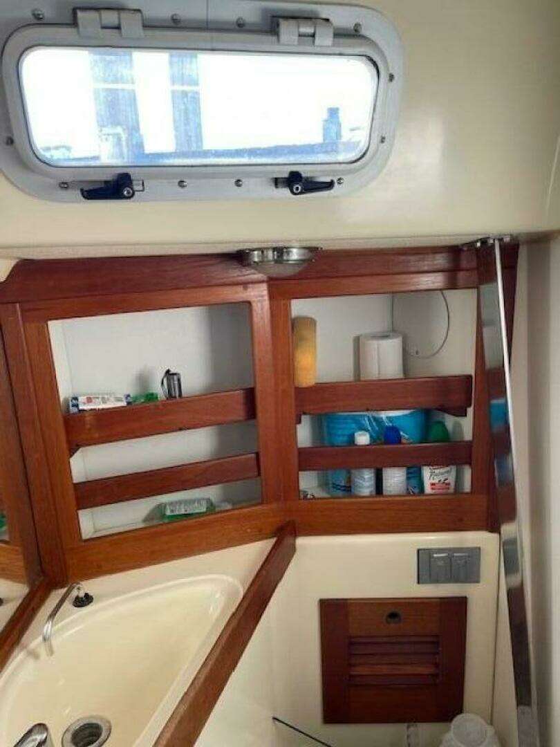 Located starboard side with door closure to fore-cabin passageway. Sink counter molded with telescopic faucet and foot actuated pump. Pressurized water with shower attachment. Cabinet and outboard storage.