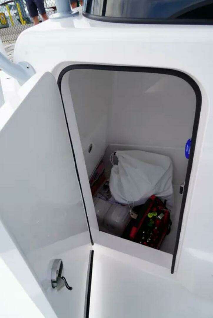 There is no shortage of lockable rod storage on the V-28, which includes up to four rod lockers under the bow casting deck. The two aft lockers can each fit three rods up to 7’, while the two forward lockers can each hold five rods from 6’6” to 7’. In addition, each forward locker can be configured to house one 9’ fly rod.