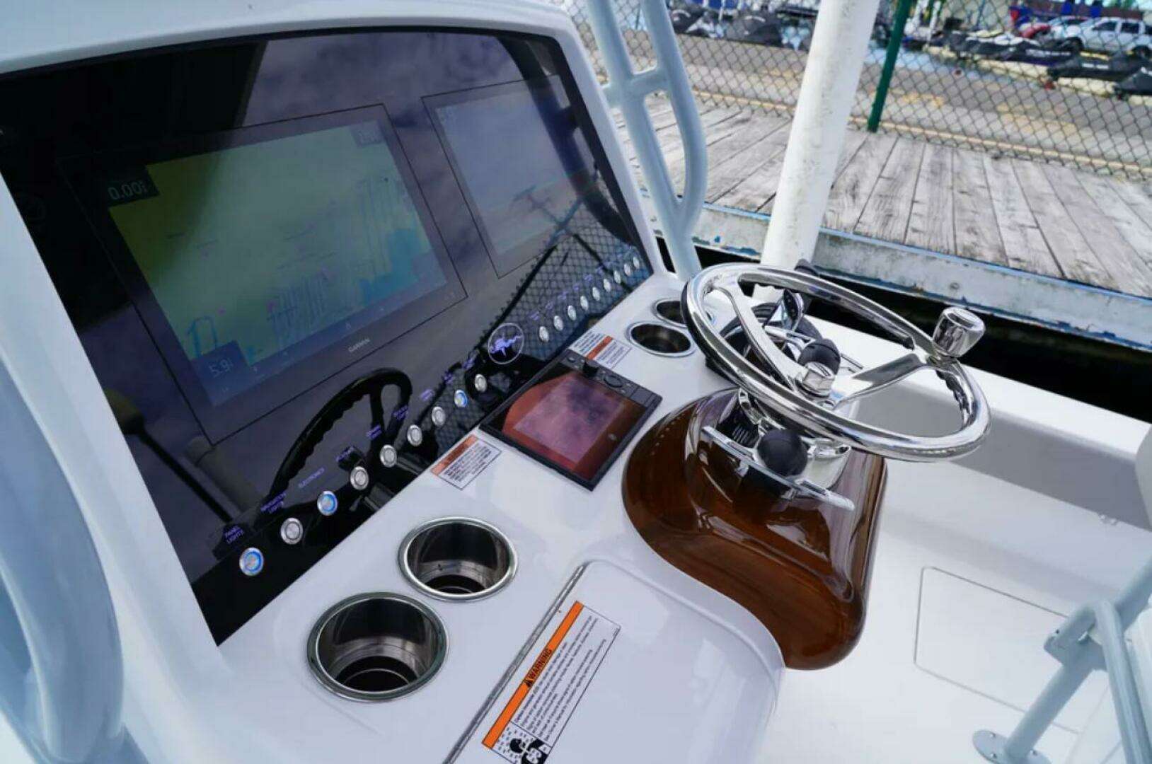 Like current V Series models, the robust helm design will feature premium equipment and electronics options, including dual 16” multifunction displays (MFDs) from Garmin or Simrad or a single 22” Garmin or 19” Simrad. Additionally, dual 19” Garmins are available. The helm also features a row of backlit-labeled Bocatech switches and a fiberglass helm pod (teak and faux teak available). Additionally, a port glove box with 12V and USB outlet and specialty features such as paddle switches on the steering column for effective handling of the standard jack plate(s) and engine trim are standard.