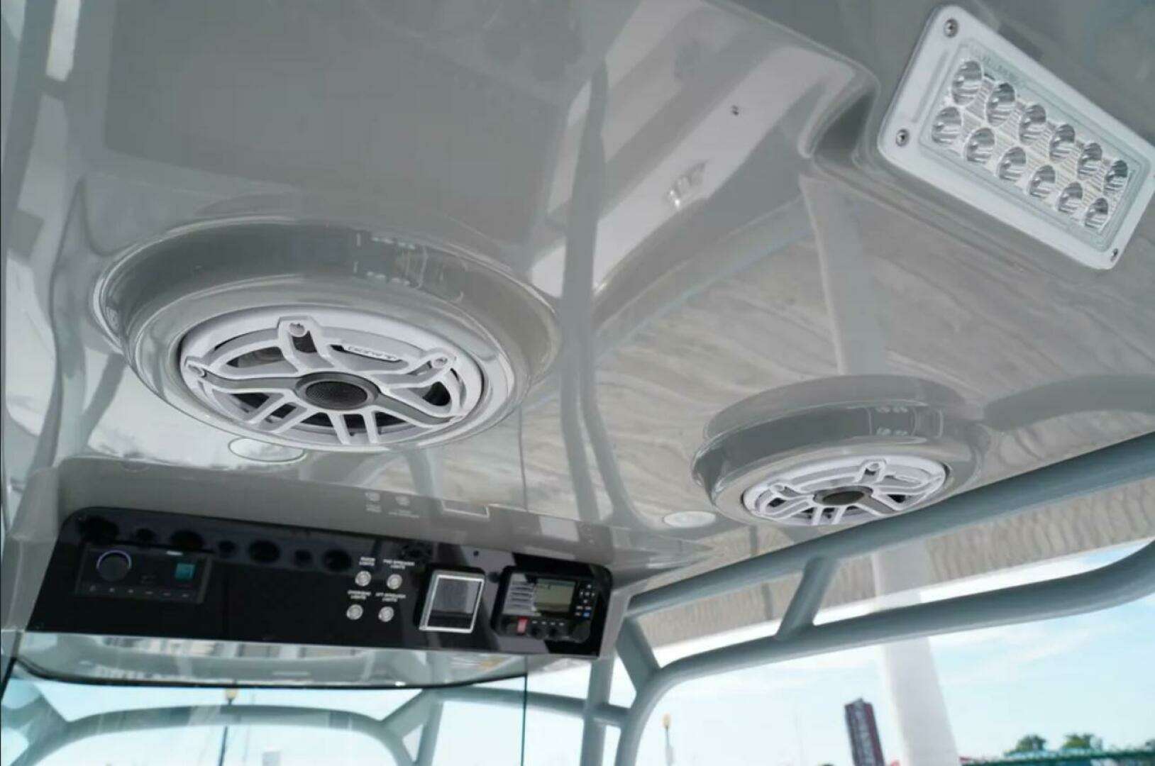 - Fiberglass hardtop w/ polished aluminium supports aft/fwd facing 2 molded-in Lumitec Mirage spreader lights, (6) rod rocket launcher, molded in overhead electronics pod, molded in radar pod and overhead lighting and 2 recessed speakers
