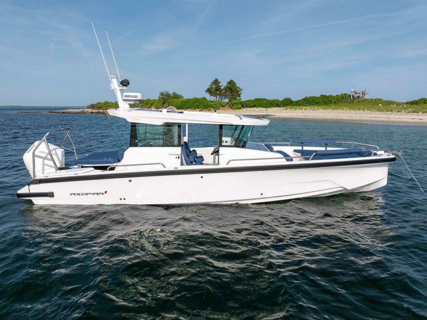 Brand new 2026 Aft Cabin Axopar 29 with Dual 200hp white Mercury engines and an elevated Mediterrana Upholstery package.