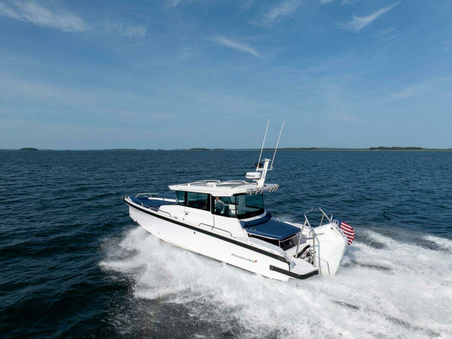 This Axopar 29 Cross Cabin with single Cold Fusion White Mercury V10 Verado engine, BRABUS performance package, and Aft Cabin is available now!